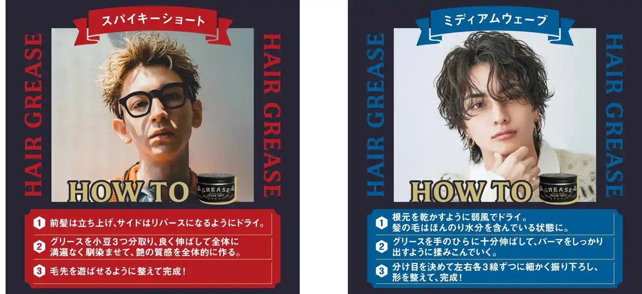 人気の理由は、グリース初心者でも直感的に扱える、柔らかめのテクスチャーが生み出す優れた操作性。髪によくなじんで自然な仕上がりを演出できるのはもちろん、ほどよいウェット感とセット力を持ち合わせ、ワックスと一緒に使うことでスタイリングの幅をより広げられる点も、支持される理由です。さらに、ダメージを受けた髪の表面を整え補修するケラチン※1を配合し、スタイリングしながらのヘアケアも可能。お湯で簡単に洗い流せ、髪に負担をかけにくいのも特徴です。 |