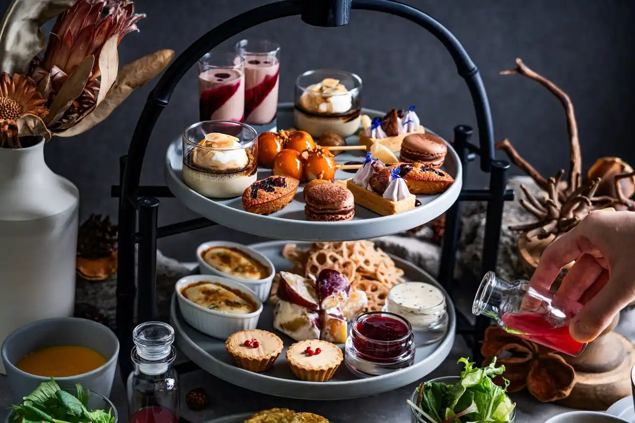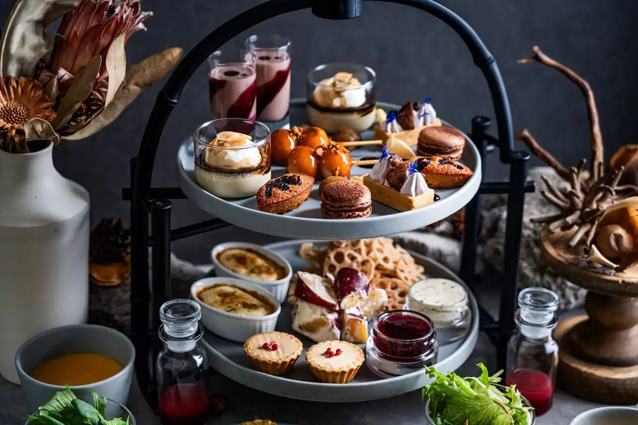 | 嵐山の秋の色彩と音色をテーマにした「オータムソネット・アフタヌーンティー」は、静けさに響く秋音を食感に見立て、ブラウンカラーの温かみを基調に秋の味覚を散りばめた特別メニューです。 | ||||||||||||||||||||||||||