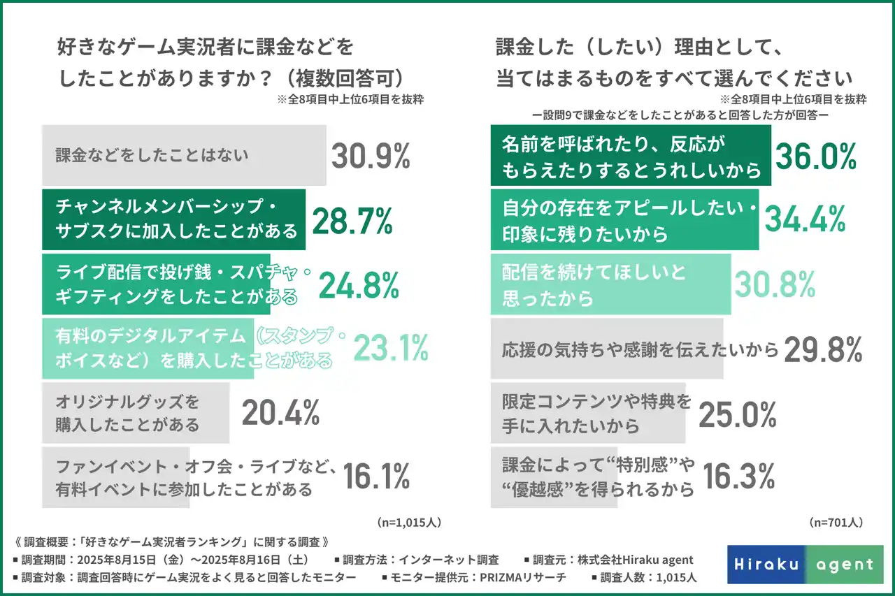 【調査期間】2025年8月15日(金)~2025年8月16日(土) 【調査方法】PRIZMA(https://www.prizma-link.com/press)によるインターネット調査 【調査人数】1,015人 【調査対象】調査回答時にゲーム実況をよく見ると回答したモニター 【調査元】株式会社Hiraku agent(https://hiraku-agent.com/) 【モニター提供元】PRIZMAリサーチ |