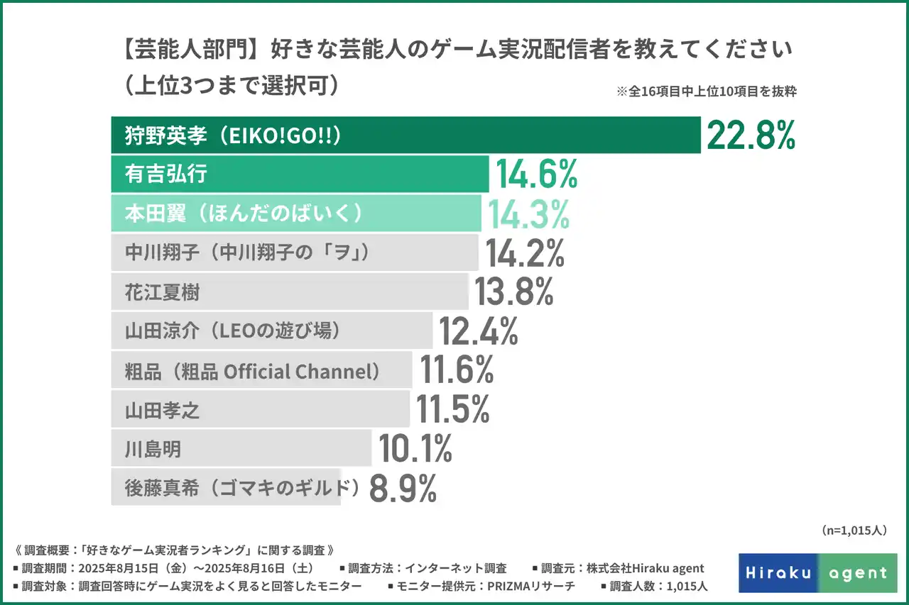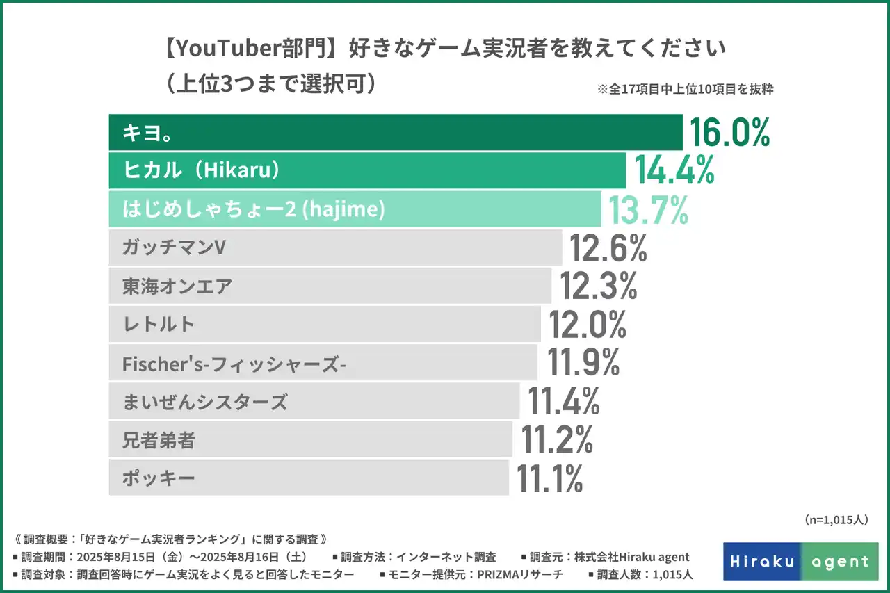 株式会社Hiraku agent(所在地:東京都品川区、代表取締役:加藤 啓介)は、ゲーム実況をよく見る方を対象に、「好きなゲーム実況者ランキング」に関する調査を行いました。