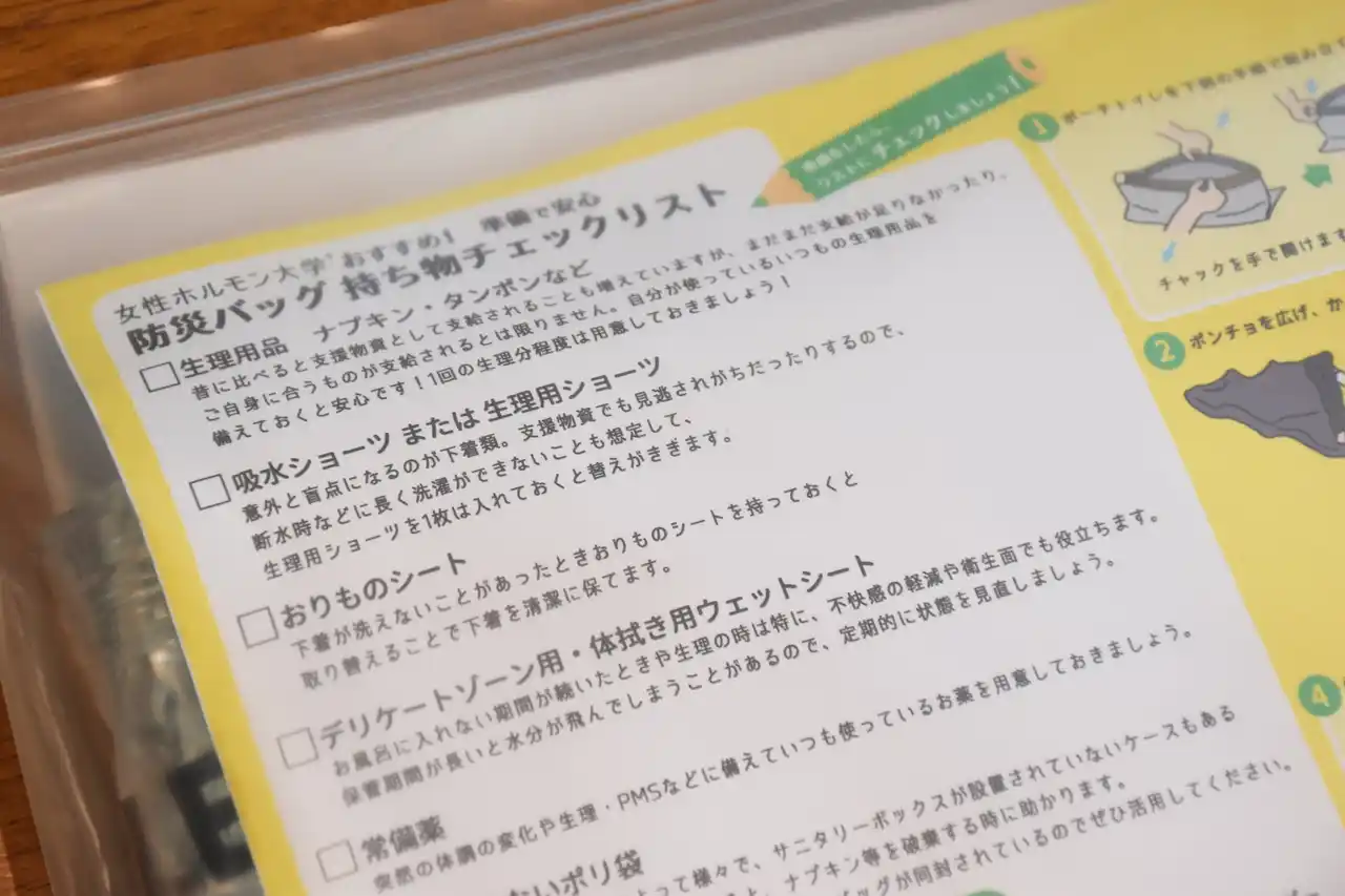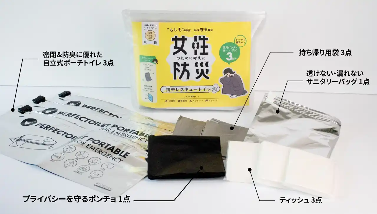 | また、屋外で使用する際にプライバシーを守れる専用ポンチョや、使用済みナプキンを入れる透けない密閉防臭サニタリーバッグも同封。女性特有の不安や不便に配慮したセット内容になっています。さらに、台紙には日頃から生理の情報を発信する「女性ホルモン大学」がおすすめする防災バッグ持ち物チェックリストを掲載し、生理用品など女性ならではの見逃しがちな防災準備品をピックアップして、防災品準備にも役立つ工夫を加えました。 | |||