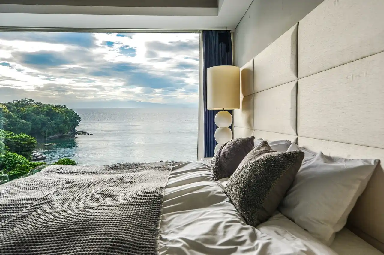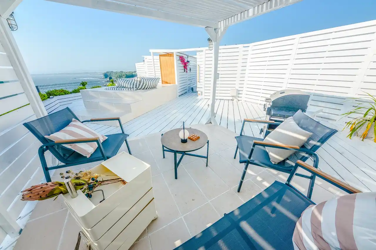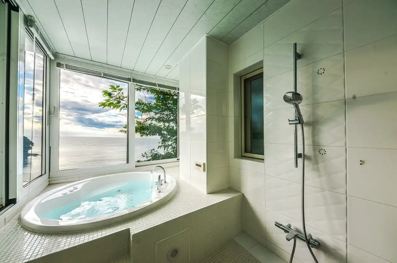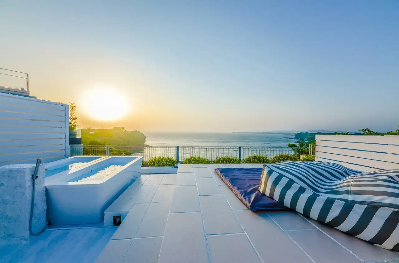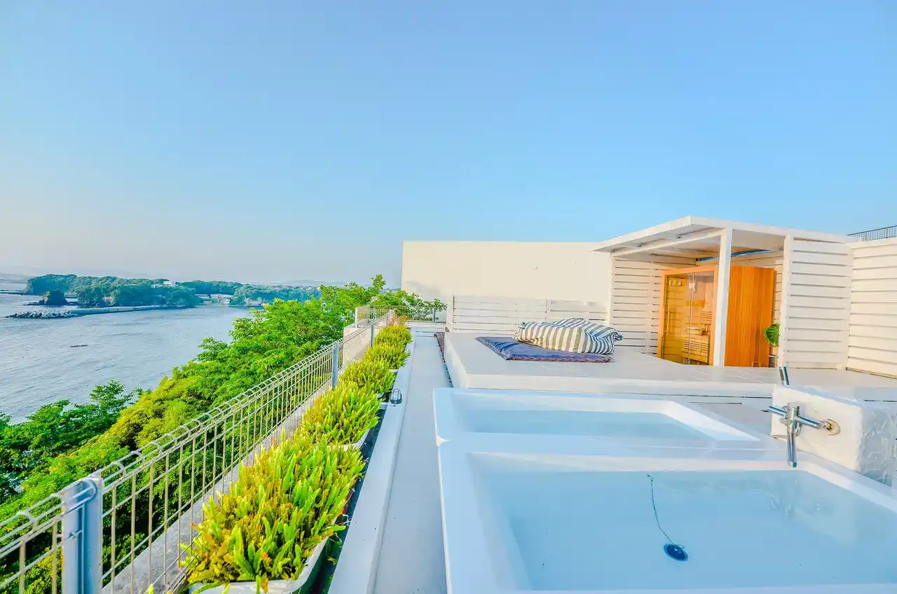 屋上に広がるRooftop Loungeから江の島まで見渡せる眺望。 空と海が溶け合う景色の中で、サウナとビューバスに身をゆだねる贅沢なリトリート。 |