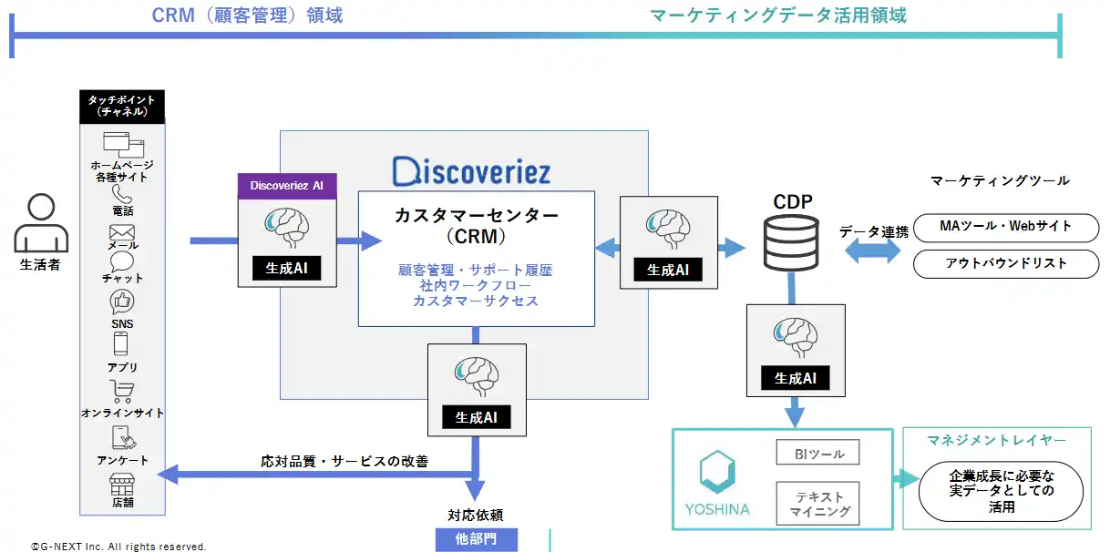 | ジーネクストの顧客対応窓口をはじめとした、企業を取り巻くステークホルダーのDXを支援するプラットフォーム「Discoveriez」で蓄積した情報をシームレスに分析ツールYOSHINAに連携できるようになりました。従来蓄積するだけで活用が難しかったデータをYOSHINAで分析できることにより、企業成長に必要な分析をすることが可能となり、すでに食品メーカー様・小売業様への連携導入が進んでおります。 | |||