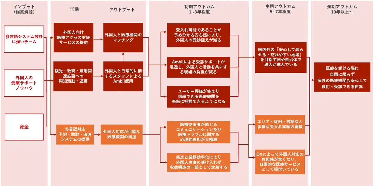 特にWeb問診票では、患者が母国語で入力した内容を日本語に変換し、医療機関のカルテと連携する仕組みを備えています。これにより、外国人患者には「安心して受診できる環境」と「健康」を、医療機関には「人的・心理的負担の軽減」をもたらします。Ambiiは今後、国内外への事業展開を進め、「自国に限らず海外の医療機関も安心して受診を検討できる世界」の実現を目指しています。 |