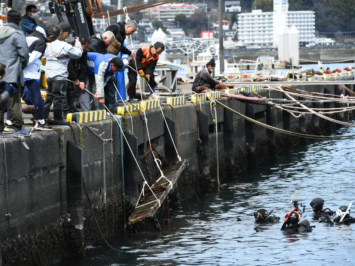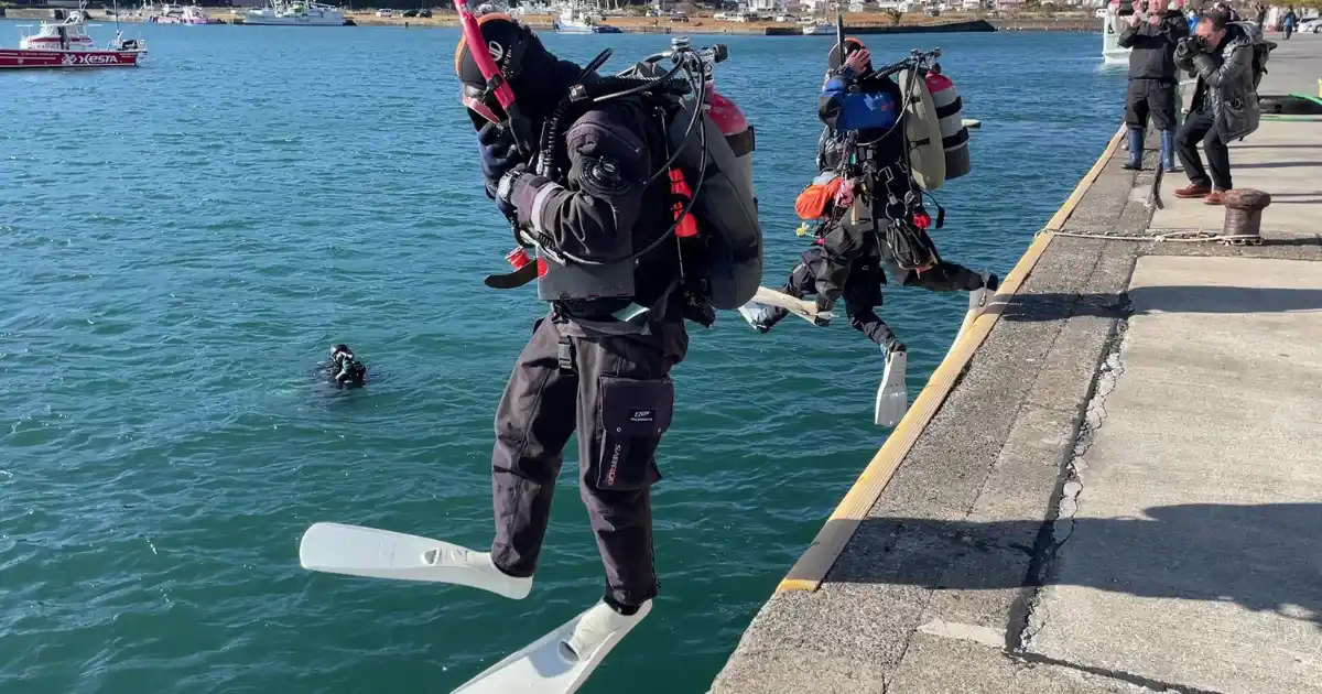 港から飛び込むプロダイバーたち。視界や状況も良くない中で、徹底した安全管理のもと作業をします。 |