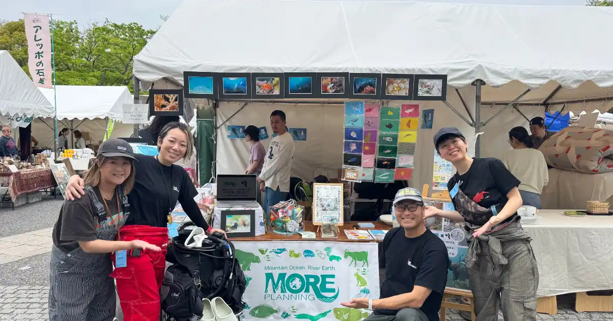山も海も、きれいに。「地球まるごとお掃除中」をテーマに街の美化も実施。メンバーの9割がスクーバダイバー。海に流れ出るゴミを減らすため、山や街の放置ゴミからもアプローチしています。多くの環境団体が海洋保全または山林保全に特化する中、MORE企画は「水の循環」という自然の摂理に着目した独自のアプローチを展開しています。 |