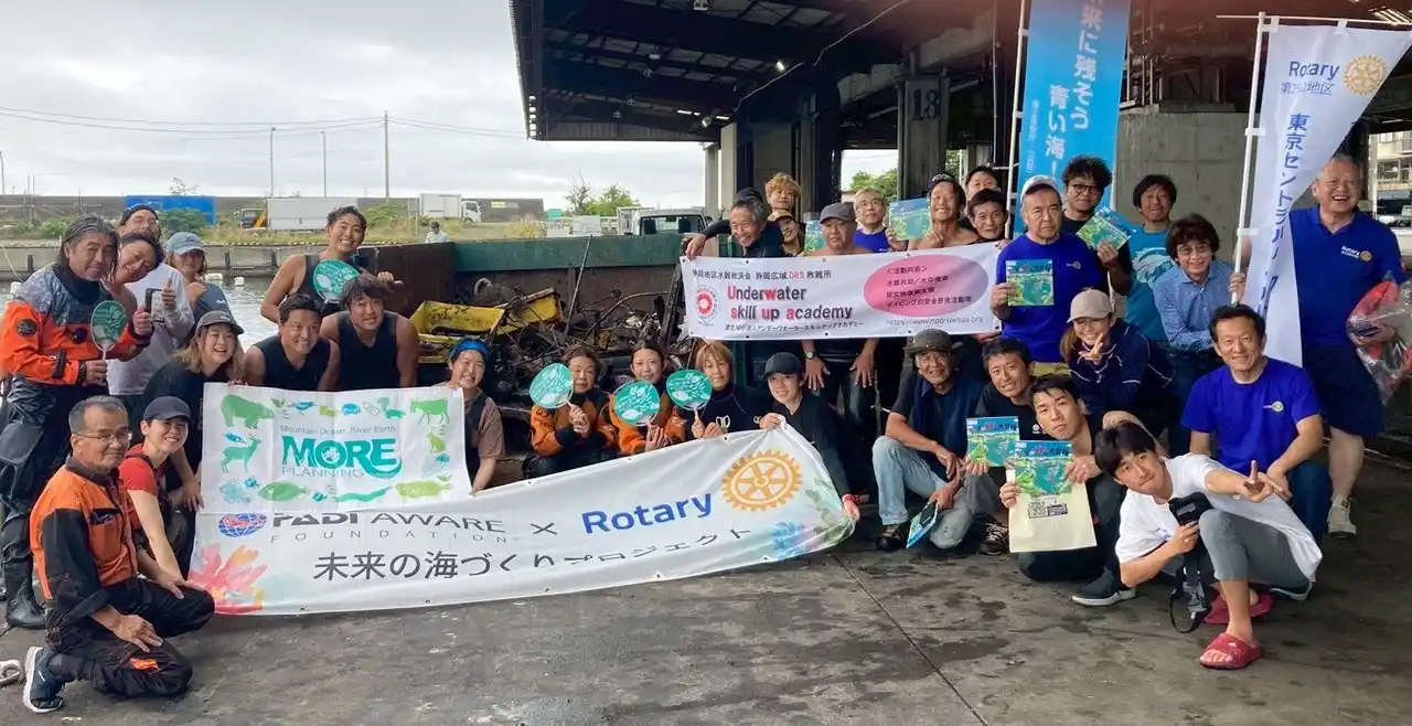 写真:PADI×ロータリークラブの看板を掲げての水中清掃請負(2025年6月24日、いとう港にて) |
