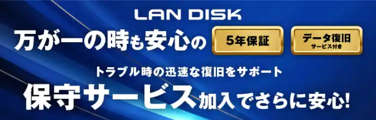 本商品は、お客様により長く、安心してNASをご利用いただくために、高い保証レベルでの”安心”を実現した「5年保証」+「データ復旧サービス」を標準添付いたしました。データ復旧作業費用合計150万円(税込)まで可能なサービスが標準でついてきます。 |