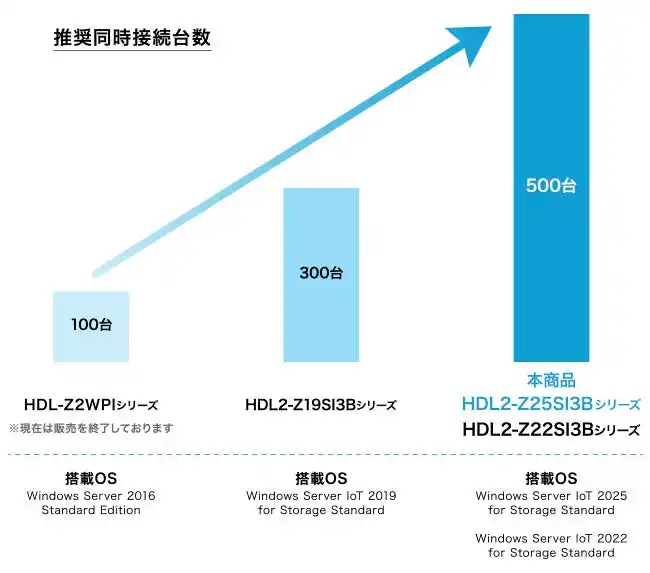 搭載CPU性能の向上により、推奨最大同時接続数が500台に大幅にアップ。これまで難しかった全社用のNASとしてもご利用いただけるようになりました。 |