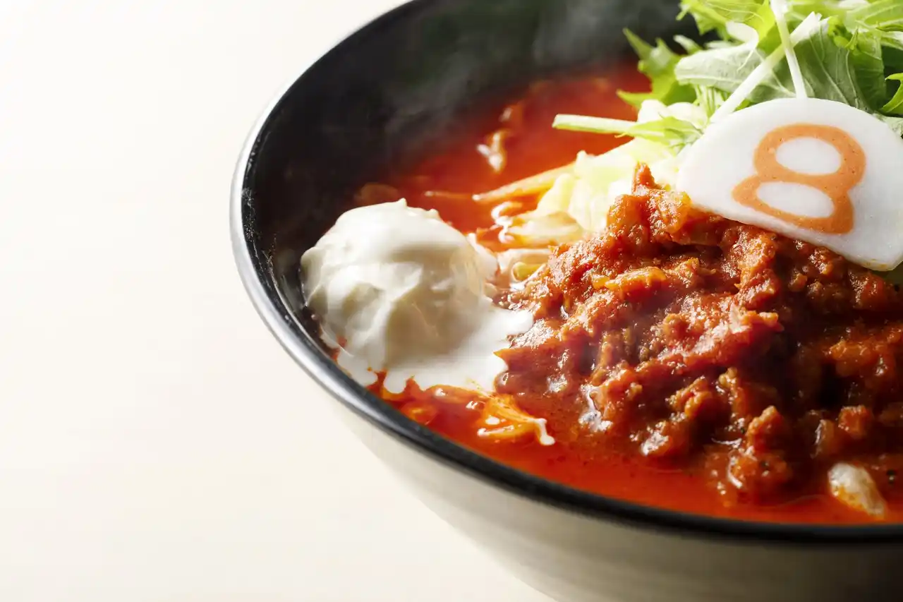 発売から12年、変わらずご好評頂いている8番らーめんの「野菜トマトらーめん」が、今年も帰ってきます。支持され続ける理由は、福井県産「越のルビー」の特徴である甘みと旨みを、程よい辛味で引き立てた特製トマトスープ。「越のルビー」を皮ごと使用することで、フレッシュな風味と果肉感が生み出すジューシーさを活かし、さらにトマトが苦手な方にも楽しんでいただけるよう、肉の旨味を生かして丁寧に仕上げました。ゴーダチーズとモッツァレラチーズをブレンドした「とろけるチーズ」や、3年ぶりに復活した「サワークリーム」をトッピングしたり、「〆のご飯」を加えてリゾット風にアレンジしたりなど、自分好みの一杯を最後の一口までお楽しみください。 |