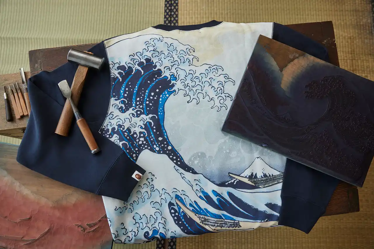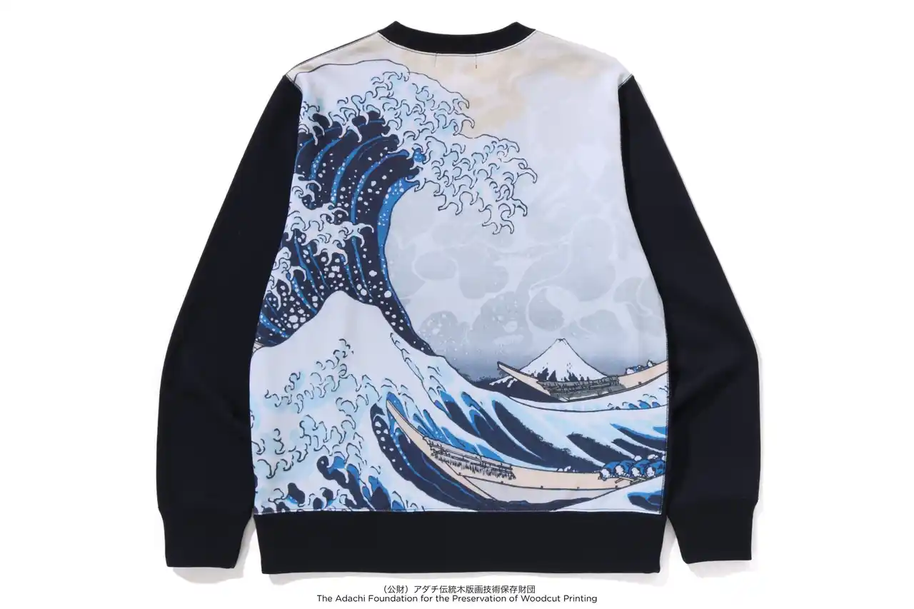 クルーネックスウェットは2型。浮世絵を大胆にバックプリントで配置し、ネイビーとブラックの2色展開となっています。