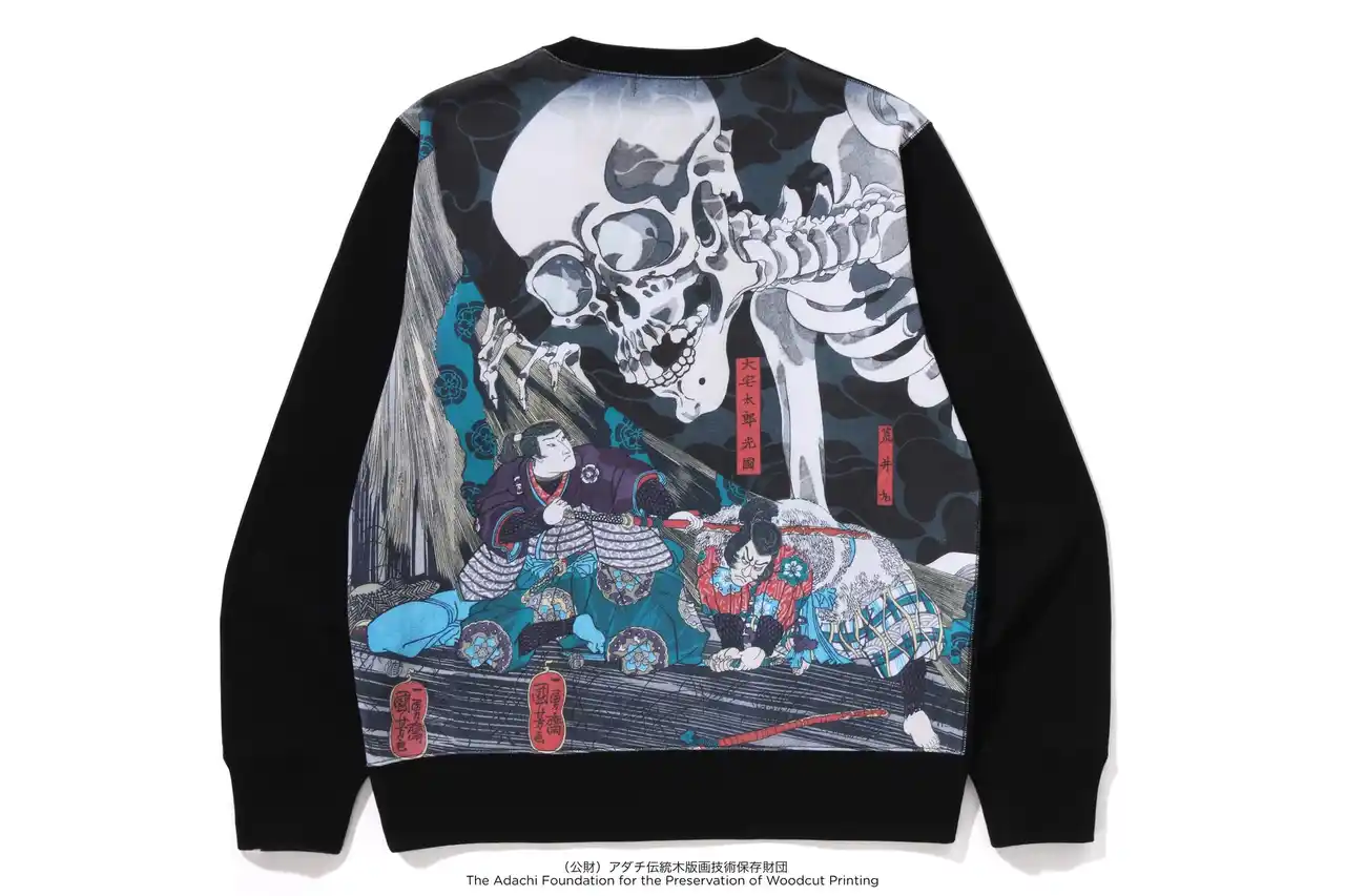 コラボレーションでは、世界的に名高い二人の浮世絵師、葛飾北斎と歌川国芳の代表作から、北斎の「冨嶽三十六景」シリーズより「神奈川沖浪裏」と「凱風快晴(通称・赤富士)」、そして“奇想の絵師”として知られる国芳の「相馬の古内裏」「金魚づくし 百ものがたり」をセレクト。いずれも江戸文化の粋を伝える名作でありながら、現代のストリートマインドと響き合うエネルギーを宿しています。これらの浮世絵に、BAPE(R)オリジナルのBAPE(R)︎ CAMOパターンを重ね、グラフィカルに再構築しました。