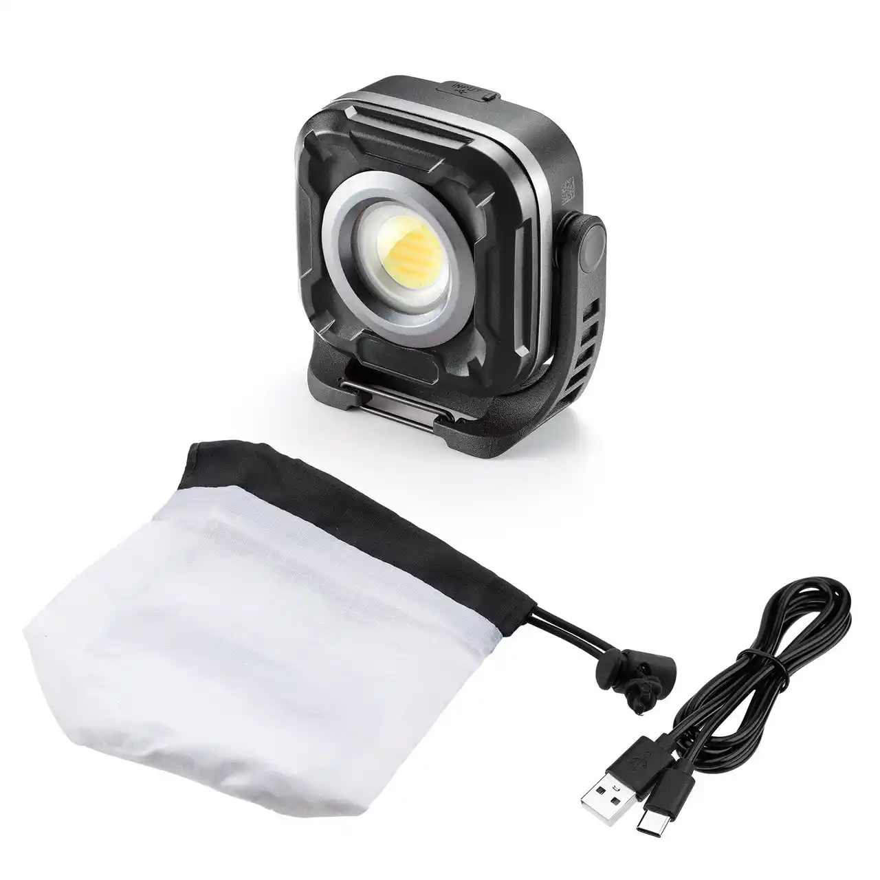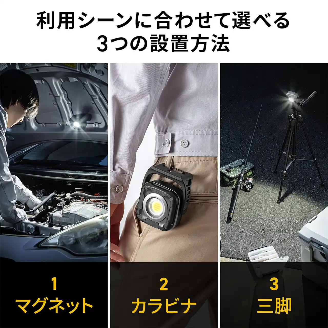 | マグネット、カラビナ、三脚設置も可能な充電式LED作業灯 |
