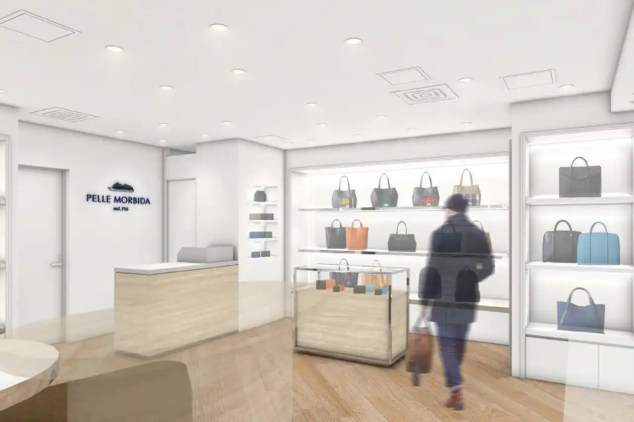 開放感のある明るい店内には、PELLE MORBIDAの定番アイテムをはじめ、この2025年秋冬の新作アイテムなど多彩な商品をラインアップ。 |