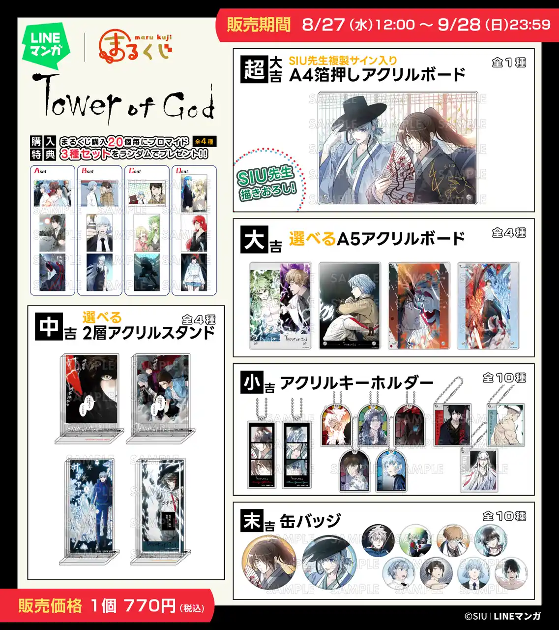 今回のまるくじ『LINEマンガ | 神之塔(Tower of God)』では、SIU先生の描き下ろしイラストや、原作ファンにはたまらない名場面を使用したオリジナルグッズをご用意しました! |