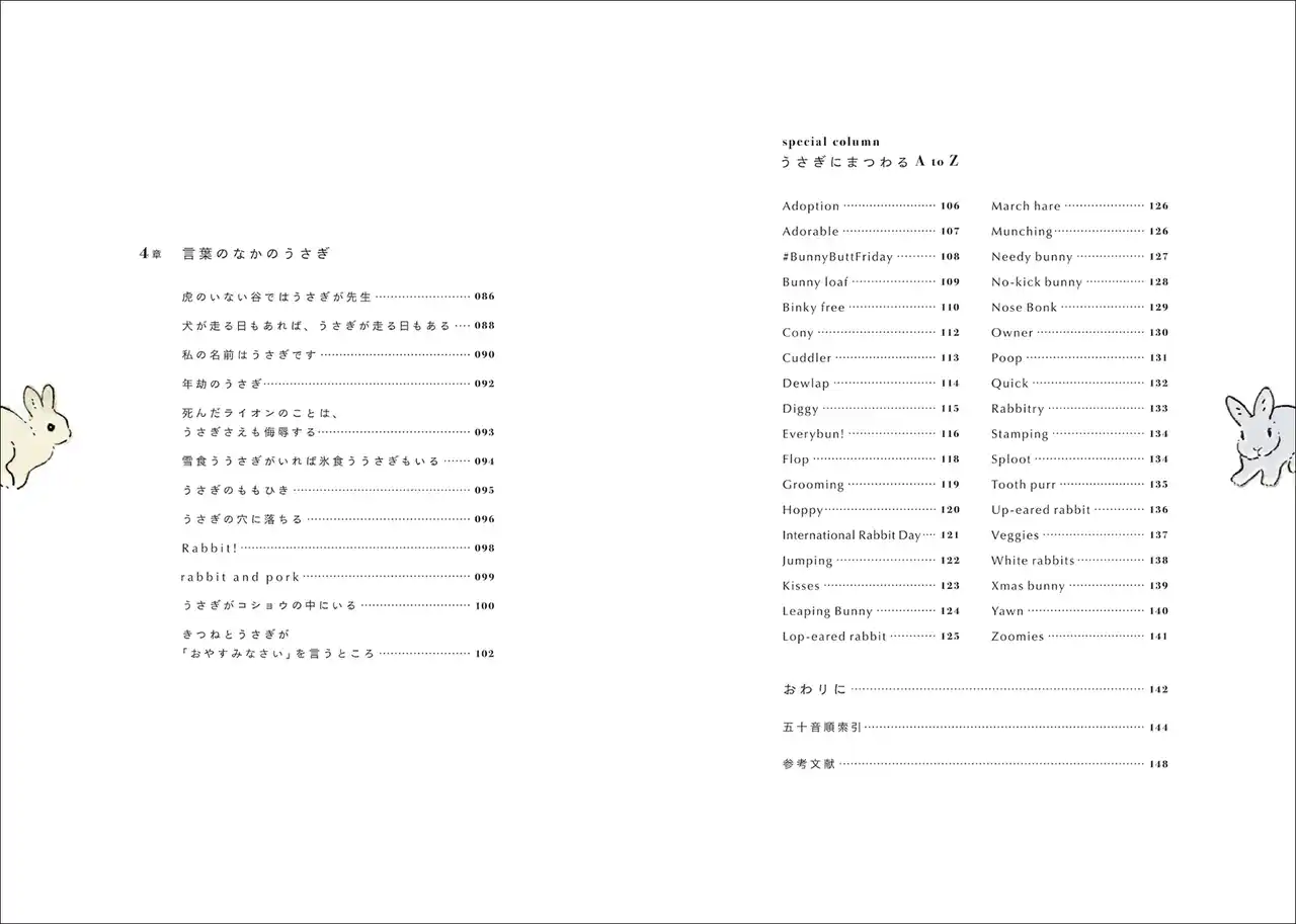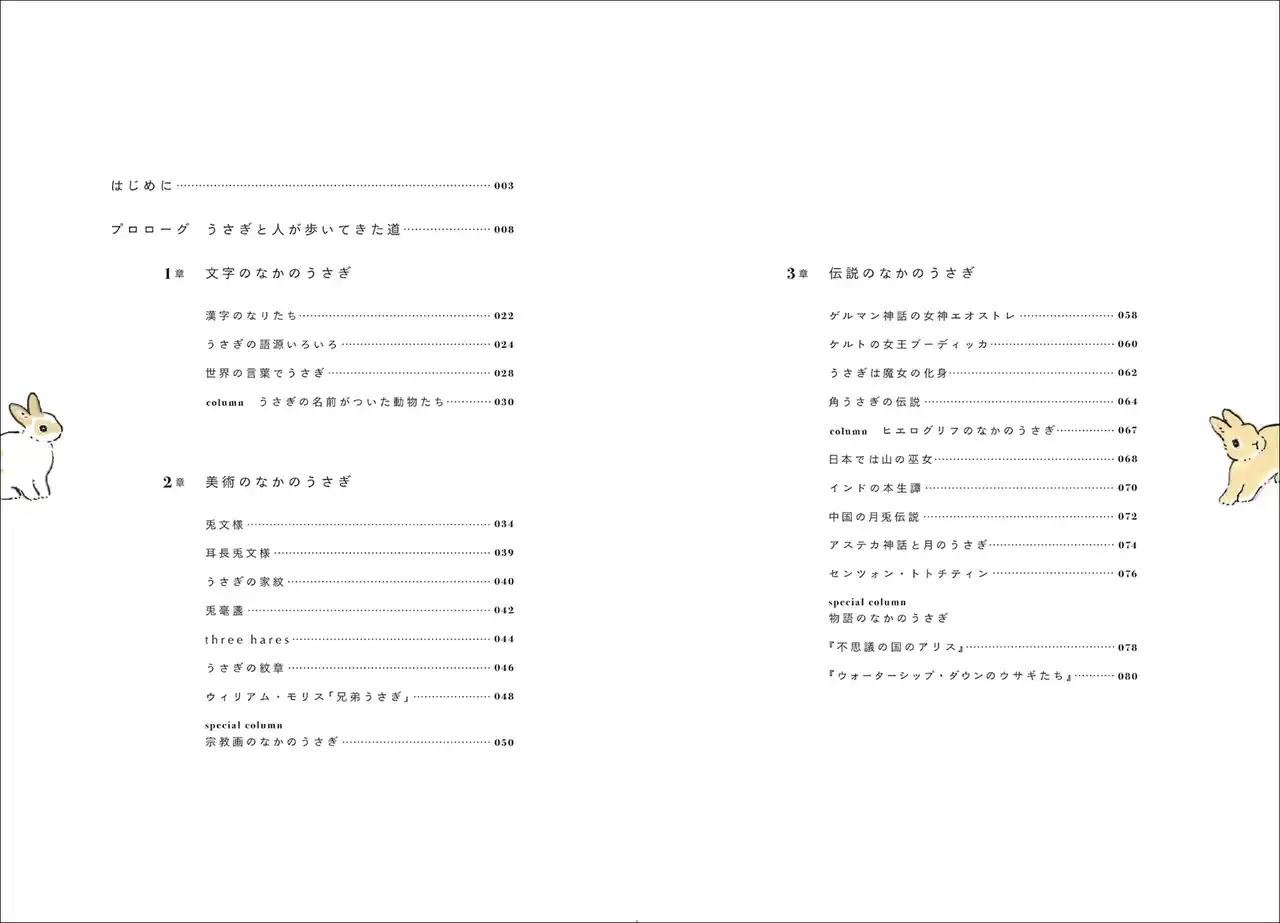 1章 文字のなかのうさぎ、2章 美術のなかのうさぎ、3章 伝説のなかのうさぎ、4章 言葉のなかのうさぎ special column: 宗教画のなかのうさぎ、物語のなかのうさぎ、うさぎにまつわるAtoZ |