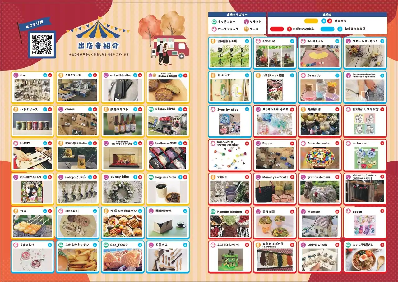 (キッチンカー6台、フード11店舗、クラフト21店舗、ワークショップ13店舗、その他1店舗) |