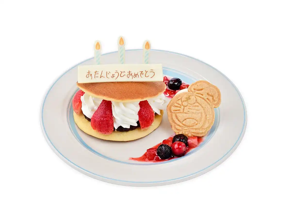 デザートメニューの「大好物でお祝い!どら焼き風の誕生日ケーキ」は、ドラえもんの大好物のどら焼きにホイップクリームやいちごを挟み、バニラアイスやドラえもんのクッキー、「おたんじょうびおめでとう」のチョコレートプレートなどを添えたプレートメニューです。クッキーはこのメニューだけの特別な仕様で、ドラえもん F’sキッチンのオリジナルコスチュームを着用しています。 |