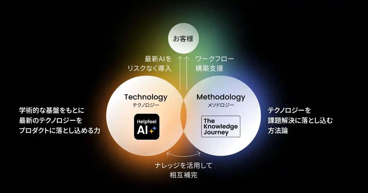 Helpfeelの独自性は、国内トップクラスの「テクノロジー」と、企業の成果創出を支える「メソドロジー」を一社で兼ね備えている点にあります。 |