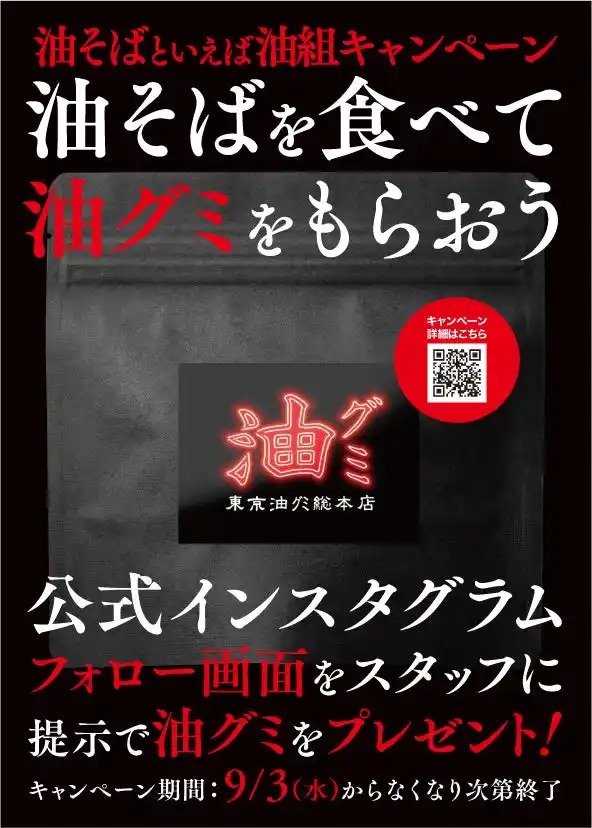 内 容: 油そばをご注文のお客様に油グミをプレゼント |