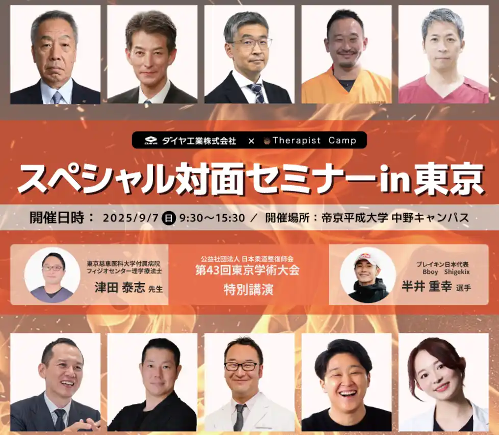 (本社:岡山県岡山市 代表取締役:松尾浩紀)は、2025年9月7日(日)に帝京平成大学中野キャンパスにて、柔道整復師・鍼灸師向けの展示商談会「柔整・鍼灸メディカルショー in 東京」を開催いたします。第5回目の開催となる今回は、医療・ヘルスケア分野の最新動向に触れる機会として、豪華な講師陣による「スペシャル対面セミナー」などを企画しています。来場特典や会場限定のキャンペーンも実施しておりますので、ぜひこの機会にご来場ください。※セラピストの方限定のイベントです