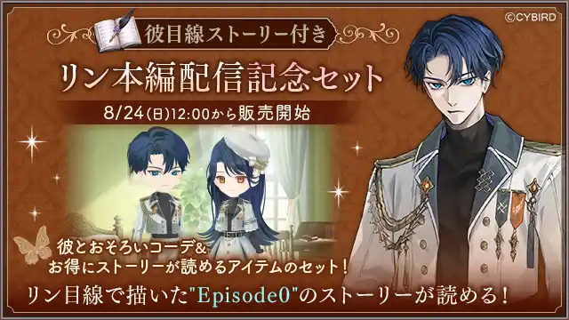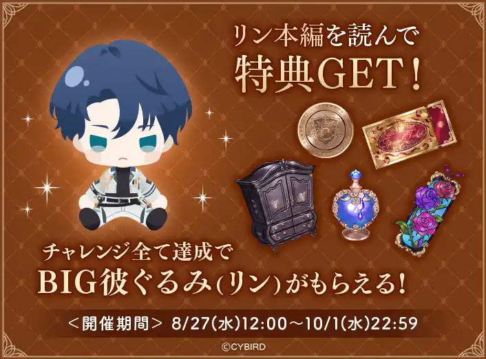 彼目線で描かれる、あなたと彼が出逢う前の「リン本編 Episode.0」が入ったお得な「本編配信記念セット」と、本編を読むことに没頭できる「リン本編没頭セット」を販売しています。他にも、「BIG彼ぐるみ(リン)」のアバターアイテムなど豪華特典が獲得できる「リン本編おとぎ師チャレンジ」を開催しています。 |