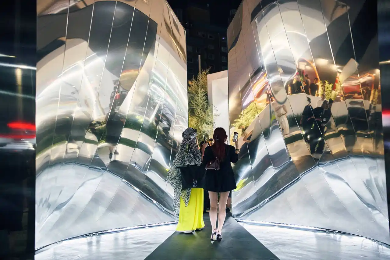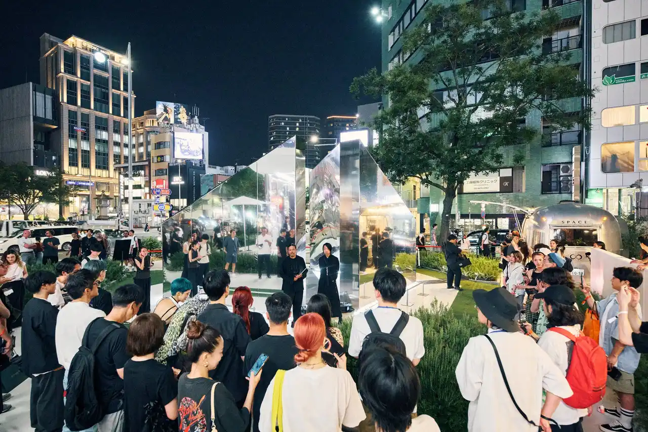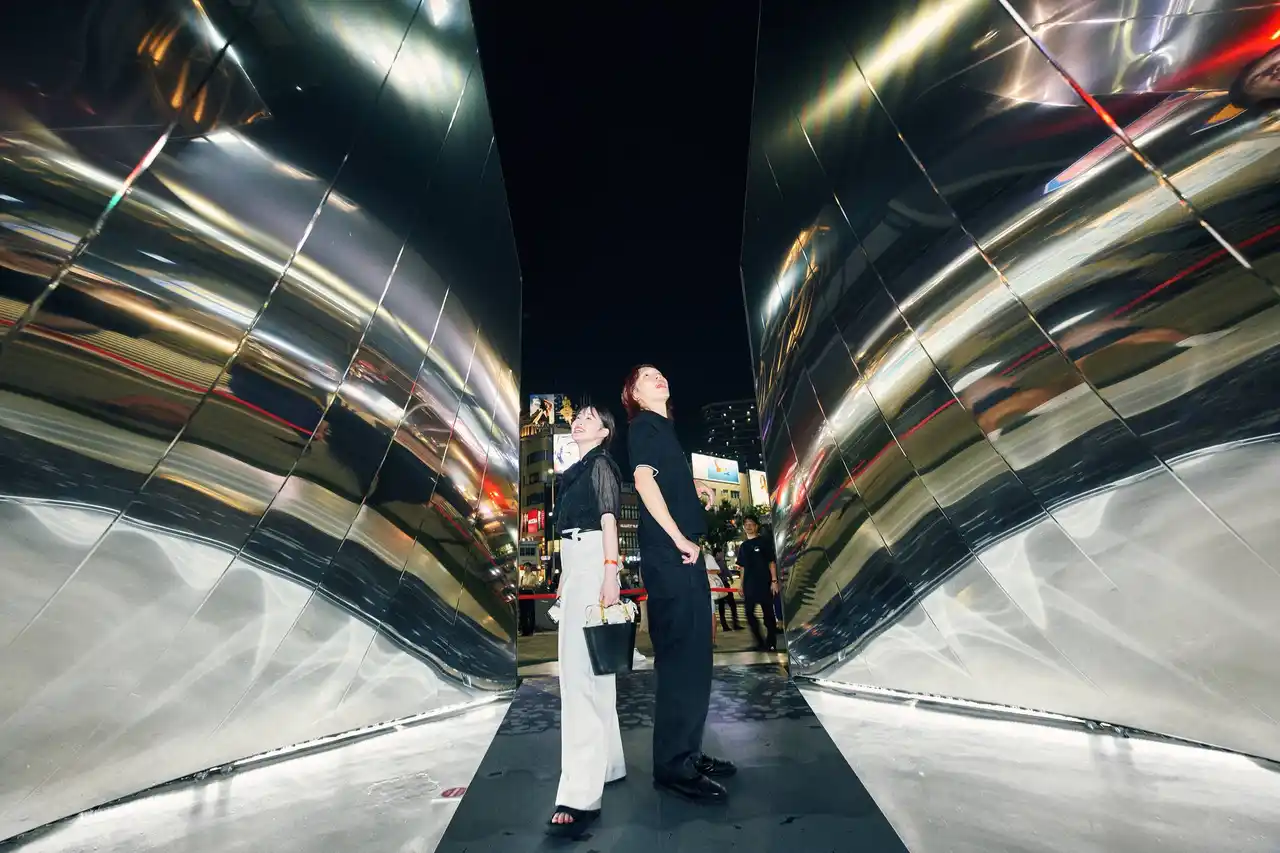 メディアアーティスト・落合陽一氏のインスタレーション《即今鏡門 / Mirrored Gate of Emergence》が来場者を出迎えます。変化する鏡が人や街を映し出し、幻想的な没入体験を提供します。 |