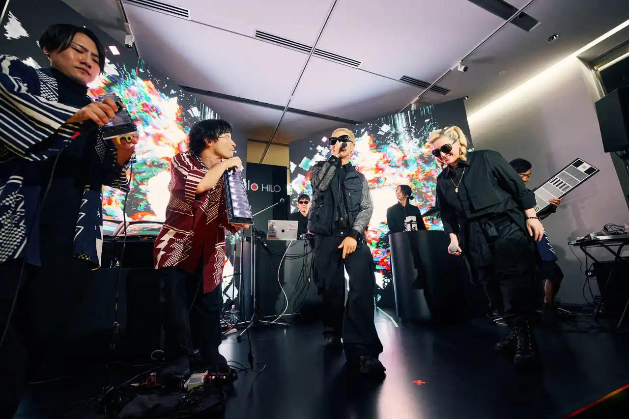 落合氏が手掛けたLEDアートインスタレーション《リキッドユニヴァース/記号宇宙のテトラレンマ的形態生成》に加え、m-floの☆Taku Takahashiによる空間音響で、「glo(TM) Hilo」の世界観を五感で体感可能。ローンチパーティー当日はライブパフォーマンスも行われました。 |