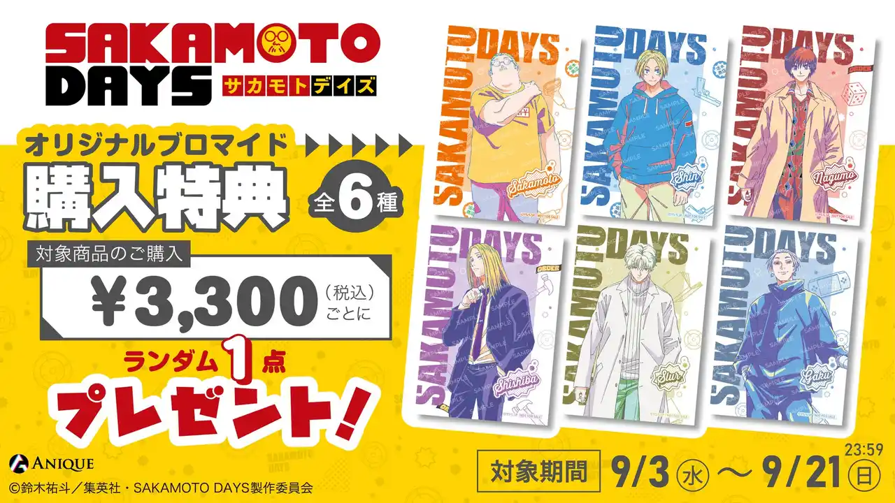 Anique株式会社(本社:東京都千代田区、代表取締役:笠井高秀)は、同社が運営するサービス「Aniqueショップ」にて、TVアニメ『SAKAMOTO DAYS』新規オリジナルグッズを予約販売いたします。 |