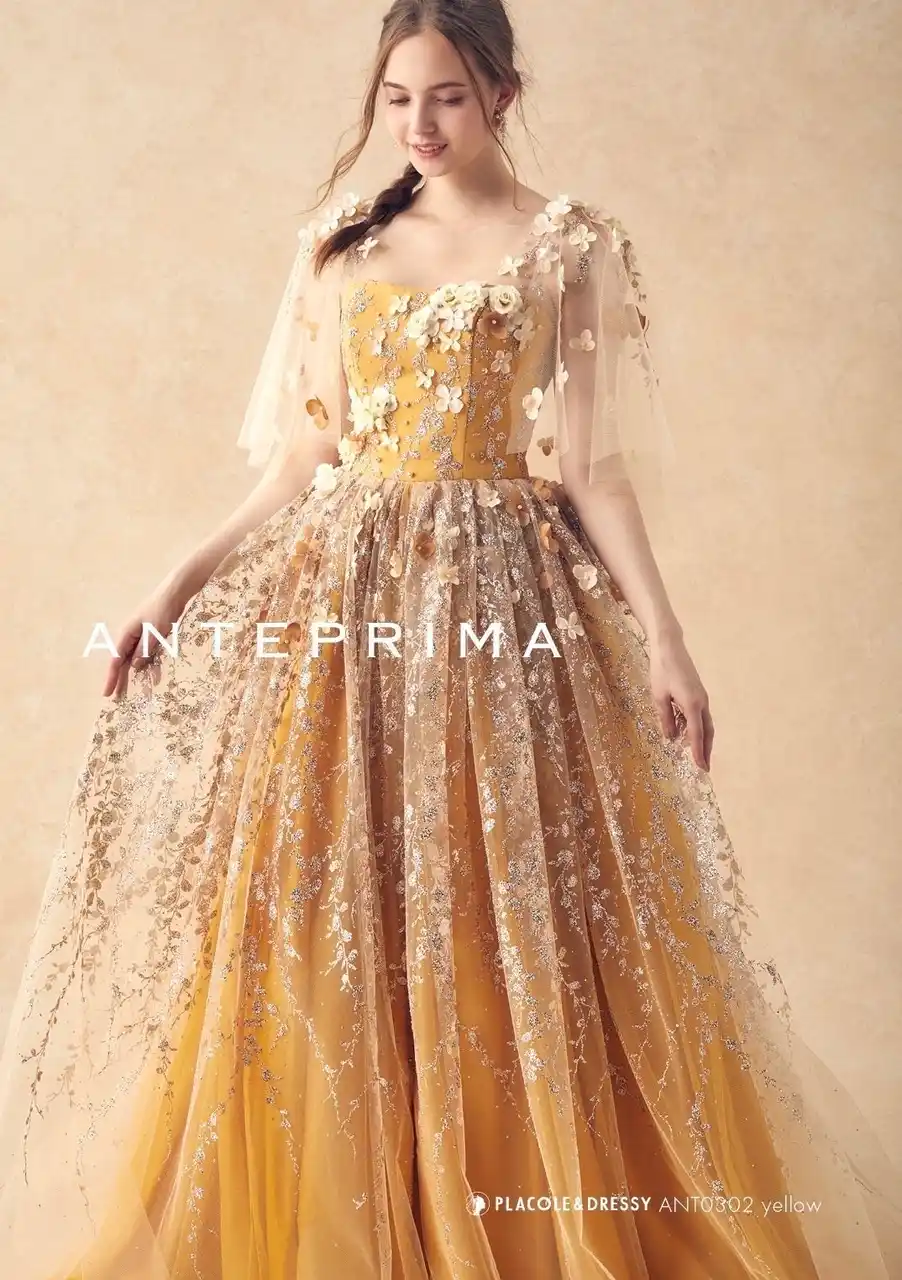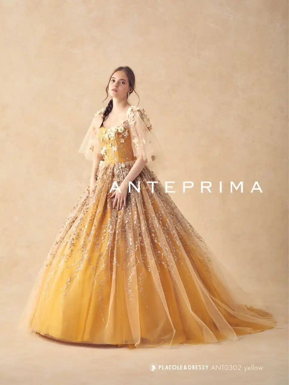 | ハッピー感いっぱいのアンテプリマフラワードレスは、プラコレ&ドレシーこだわりの紅茶(CHEERS)をイメージしたシャンパンイエローの絶妙な色使いで、他のブランドでは表現できない花嫁姿を実現させます。透明感あるヨーク・ケープも取り外せて、トップスに柔らかい優しさを印象づけるドレスです。 | ||||||||||||||