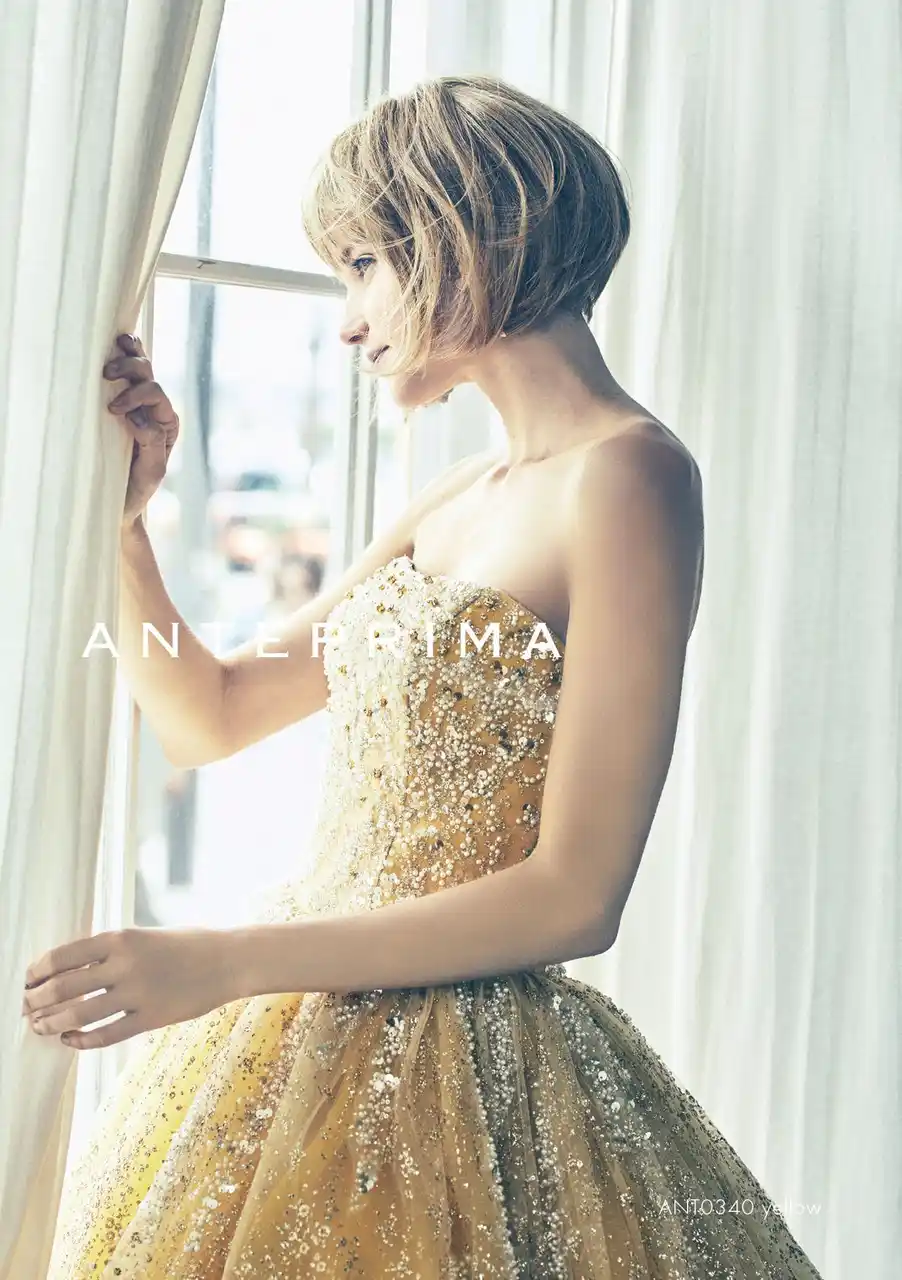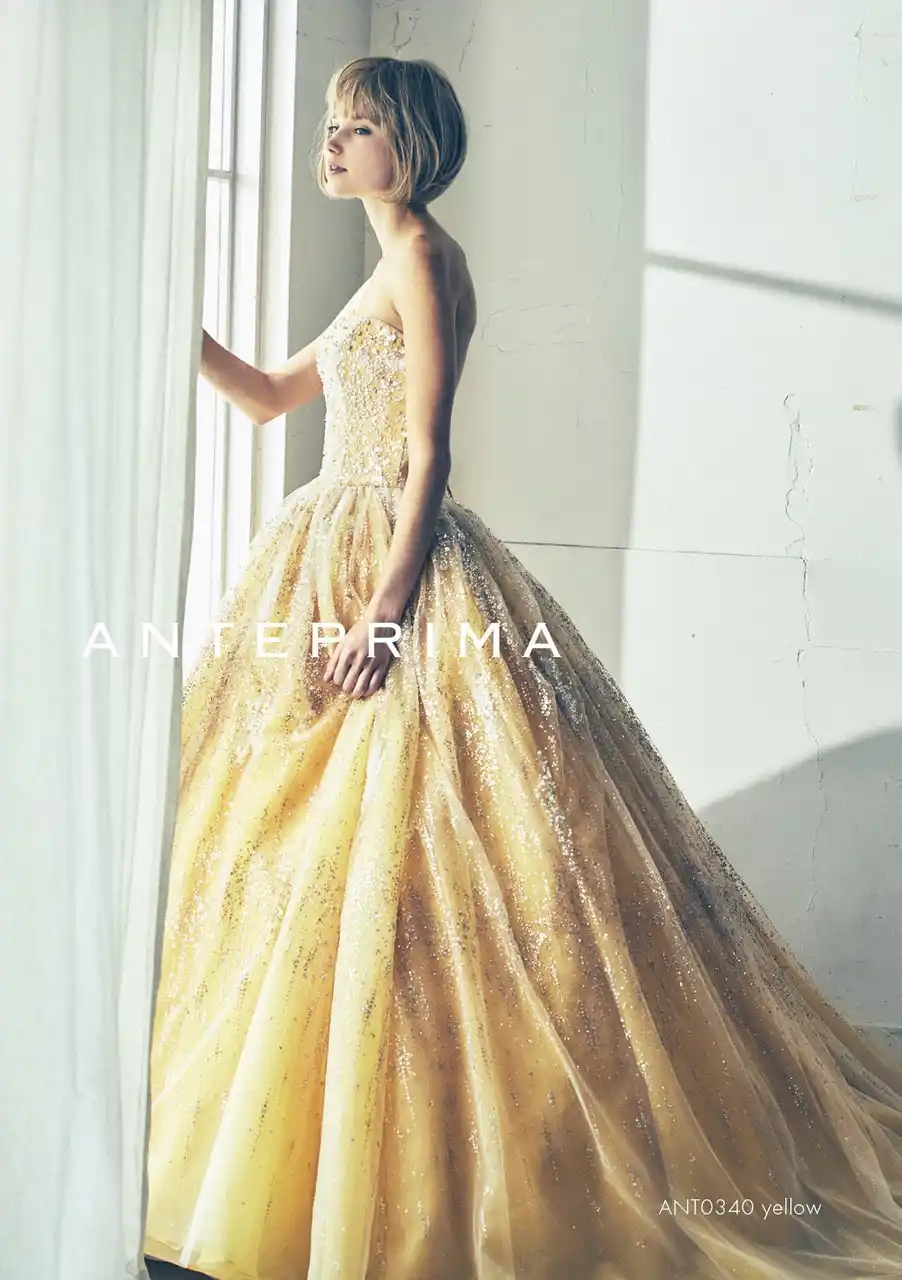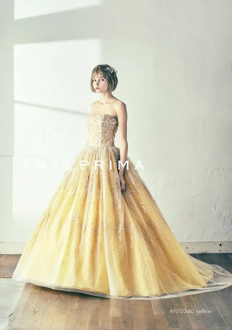 | 寄りも引きも映える装飾と定番シルエットが融合した、最強のドレス。コレクションで常にトップに君臨する濃いめのイエローは、上品でエレガントに着こなせます。グリッターだけでなく、ミニパールとクリアスパンコールのライティング効果で、ゲストの視線を独り占め。ラグジュアリーを極めたANTEPRIMAらしいカラードレスです。 | ||||||||||||||