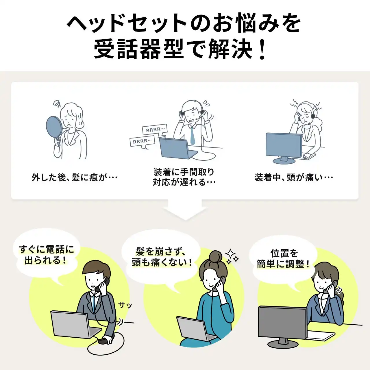 | 一般的なヘッドセットが苦手な方にぴったりの受話器型デザイン。髪型を崩さず、長時間の使用でも頭や耳に負担がかかりません。自然に手になじむ形状で、電話感覚の安心した通話体験を実現します。 | |||||||||||||||||