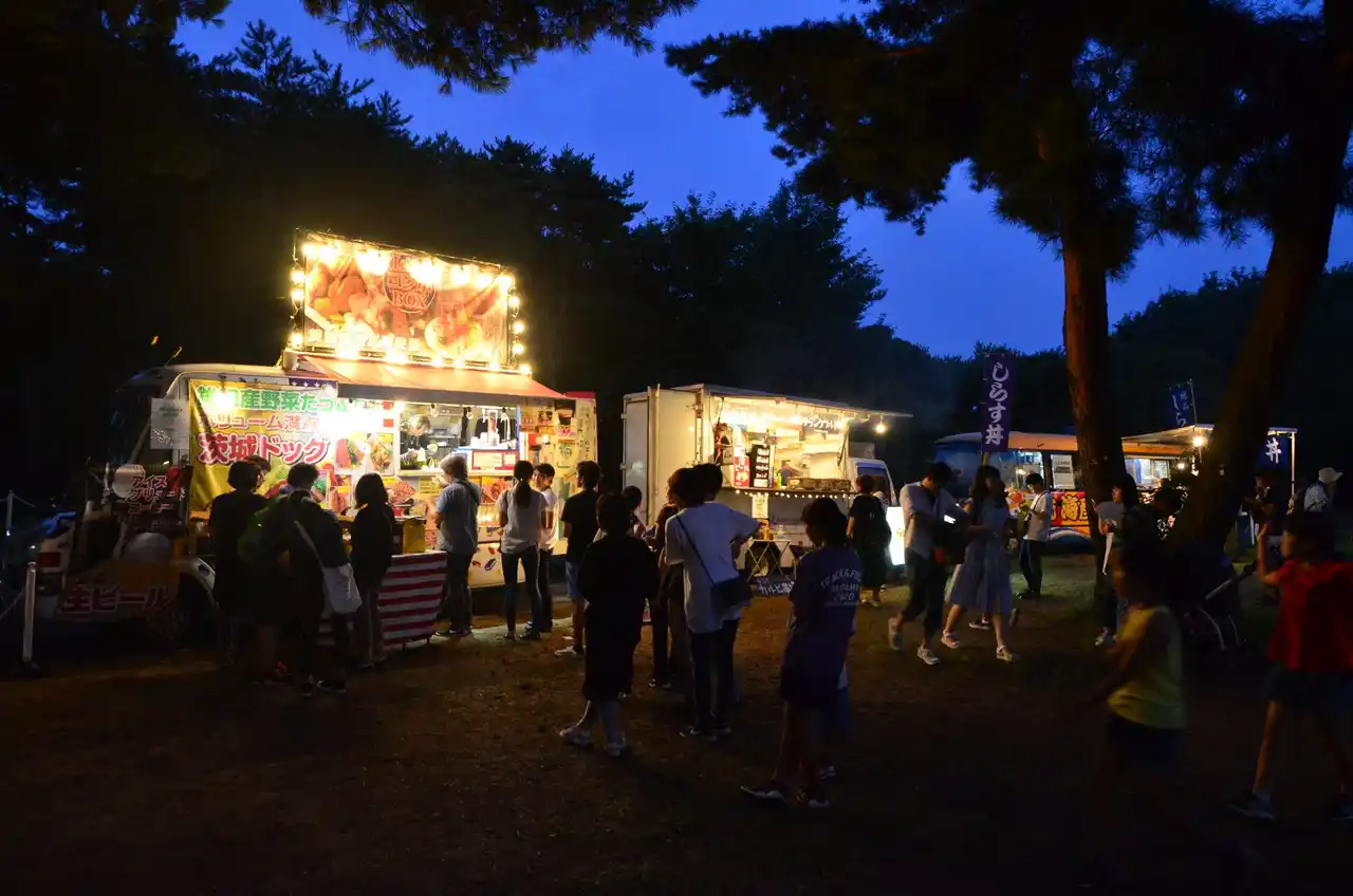 ライトアップとともに楽しめるのが“グルメ”です。入口付近の西池に位置する「レイクサイドカフェ」がコキアライトアップで初めてのオープン。夜景とともにドリンクやスイーツをゆったり味わえます。また、今年は例年を上回る数のキッチンカーが集結。地元・茨城ならではの食材を使ったメニューから、ライトアップに映えるフードまで、多彩なグルメが勢揃いします。 |