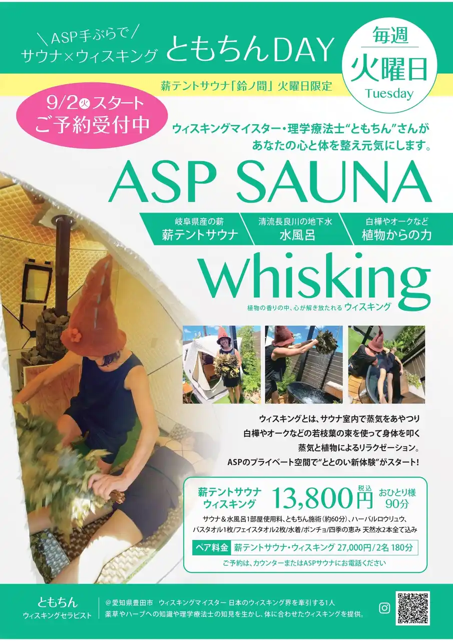 ASP SAUNAならではの特長 これまで各地でイベントのみ提供されていたウィスキングを、ASP SAUNAでは岐阜県内で初めて(※)施設サービスとして定期的に体験できるようになりました。 薪サウナならではのやわらかな遠赤外線の熱と燃える木の香りが、ウィスキングのリズムや香りの効果を最大限に引き出します。 さらに、専門資格を持つウィスキングマイスター・理学療法士の「ともちん」が、体の状態に合わせて安全かつ心地よく施術します。 |
