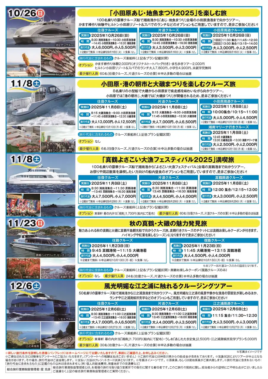 | 片道・往復・周遊のクルージングがあるほか、港周辺での食事や体験のオプションもあります。 | |||