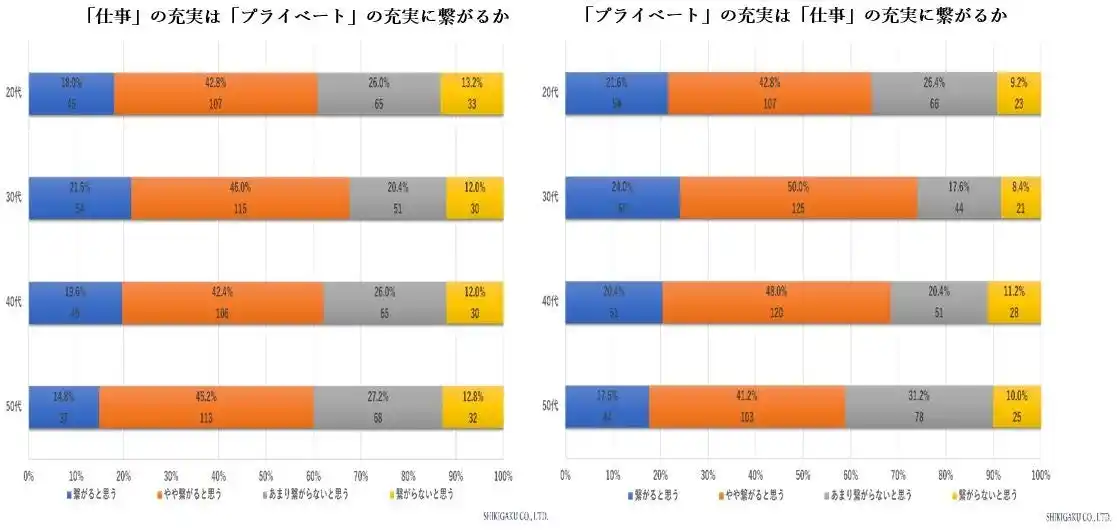 「仕事」を充実させると「プライベート」も充実するのか?または、その逆はどうか?に関しては、共に、6割以上の人が「仕事」の充実が「プライベート」の充実に、そして「プライベート」の充実が「仕事」の充実に繋がると回答しています。 |