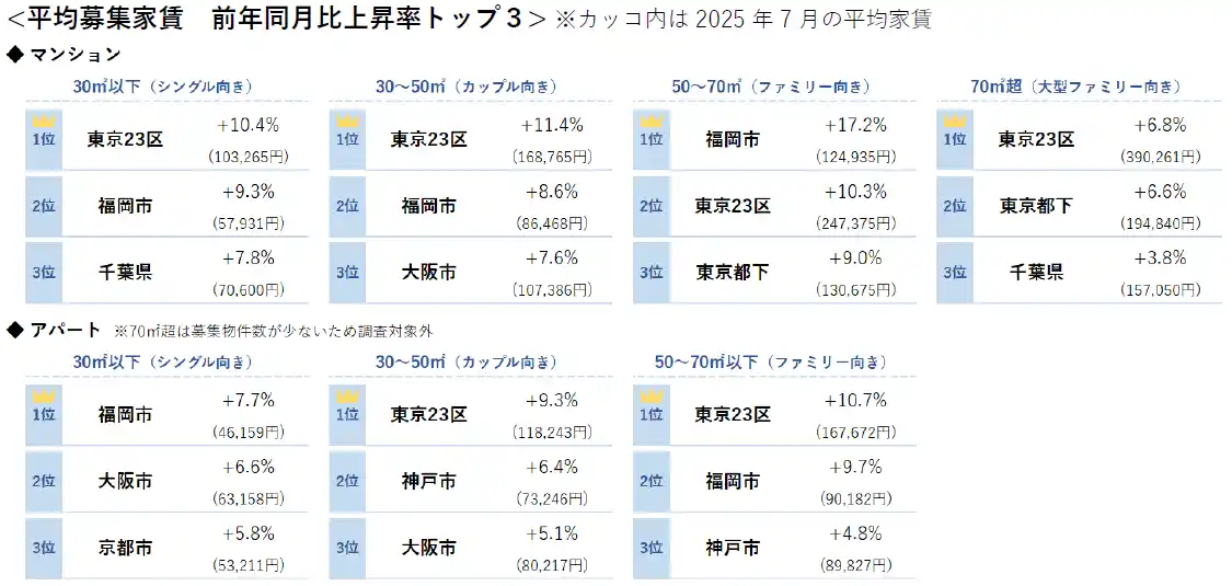 <2025年7月 全国主要都市における賃貸マンション・アパートの平均家賃(面積帯別)> |