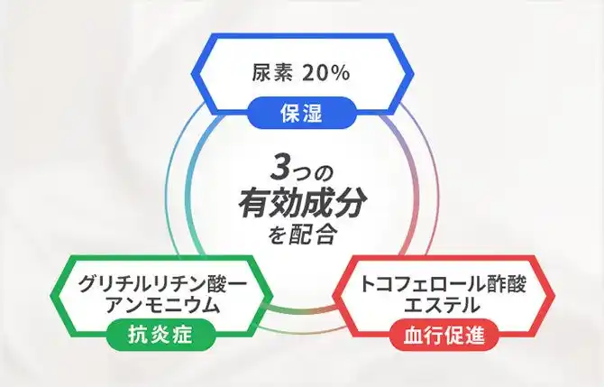 20%配合の尿素のチカラで爪まわりの固くなった角質を柔らかくし、除去をしながら水分を保持します。加えて、皮膚の炎症を抑えるグリチルリチン酸一アンモニウム、血行促進と皮膚の代謝を助けるトコフェロール酢酸エステルの3つの有効成分をバランスよく配合しました。爪まわり特有の症状に特化したケアができます。 |