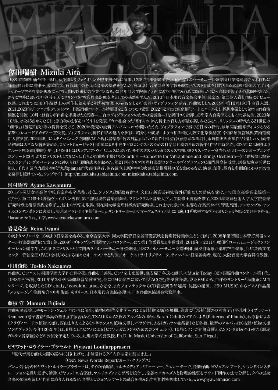打楽器奏者/作曲家の會田瑞樹はこれまでに300作品以上の新作初演を手がける”初演魔”の異名を持つ音楽家。作曲家として管弦楽から歌曲にいたるまで作品数は100作品を超え、その作品はNHK放送はじめ、リトアニア国営放送での中継など、国際的にも注目を集め続けています。昨年にはリトアニア・聖クリストファー室内合奏団の委嘱により作曲されたヴィブラフォンと弦楽オーケストラのための《Stardust》は熱狂的な成功を飾りました。本年も多数の委嘱に応え次々と新作を発表。7月にはタイ/バーンソムテッド・チャオプラヤ・ラーチャバット大学において作曲講座を開催するなど、国際的な注目も年々高まりを見せており、演奏家としてはサントリーサマーフェスティバル2025に参加するなど、その活動は多岐に渡ります。