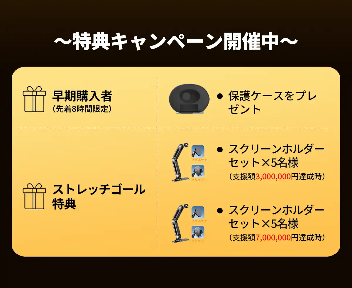 さらに、プロジェクト公開を記念して、【先着8時間限定プレゼントキャンペーン】&【ストレッチゴールキャンペーン】も開催決定!ぜひお見逃しなく~