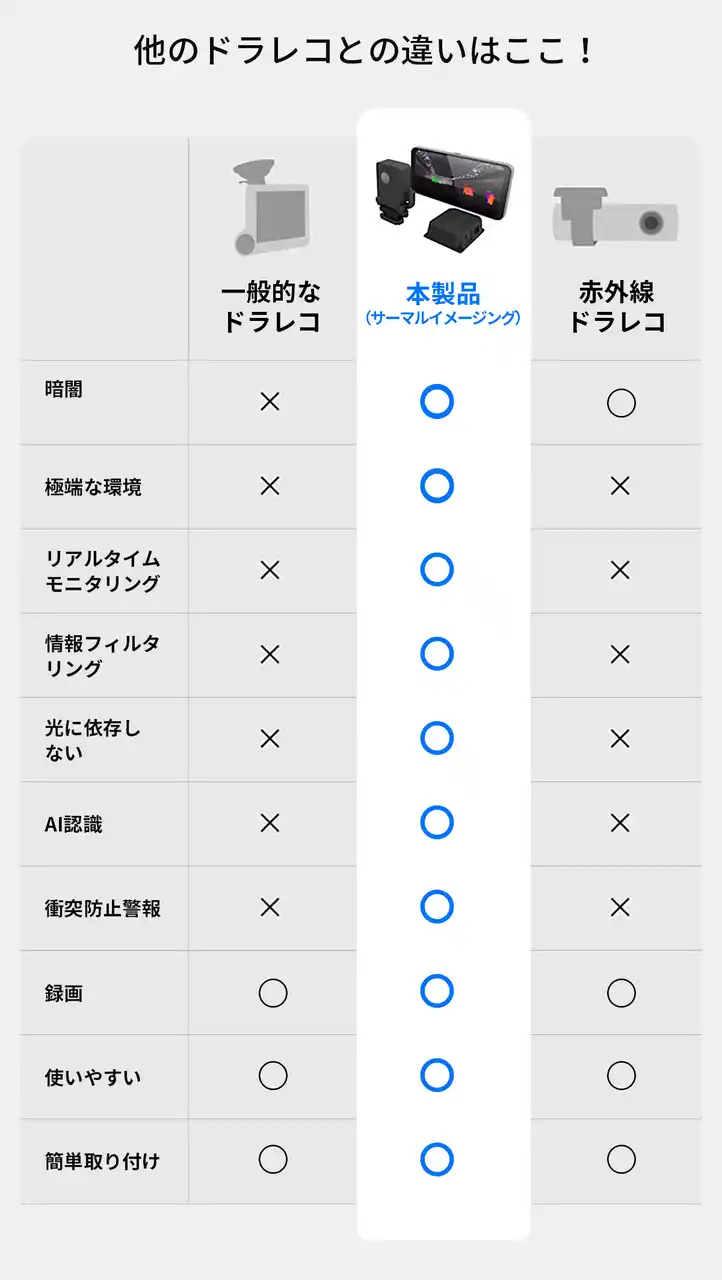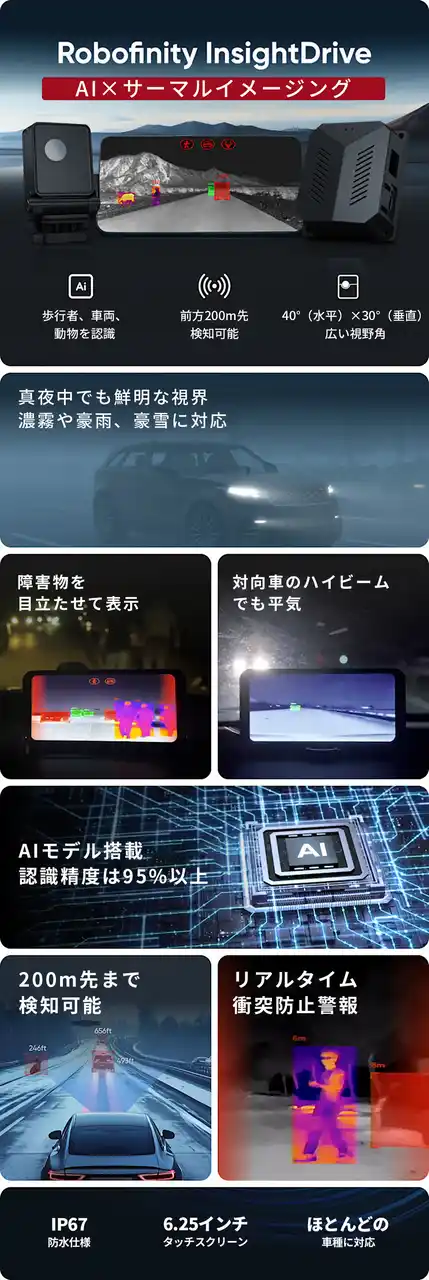 「Robofinity InsightDrive X1」は今までのドライブレコーダーと一線を画し、サーマルイメージング技術×高精度AIを集約した次世代サーマルイメージングドライブレコーダーです。目視や一般的なドライブレコーダーに比べて、道路における潜在的な危険をより精確に検出し、事故を未然に防ぐことが可能! |