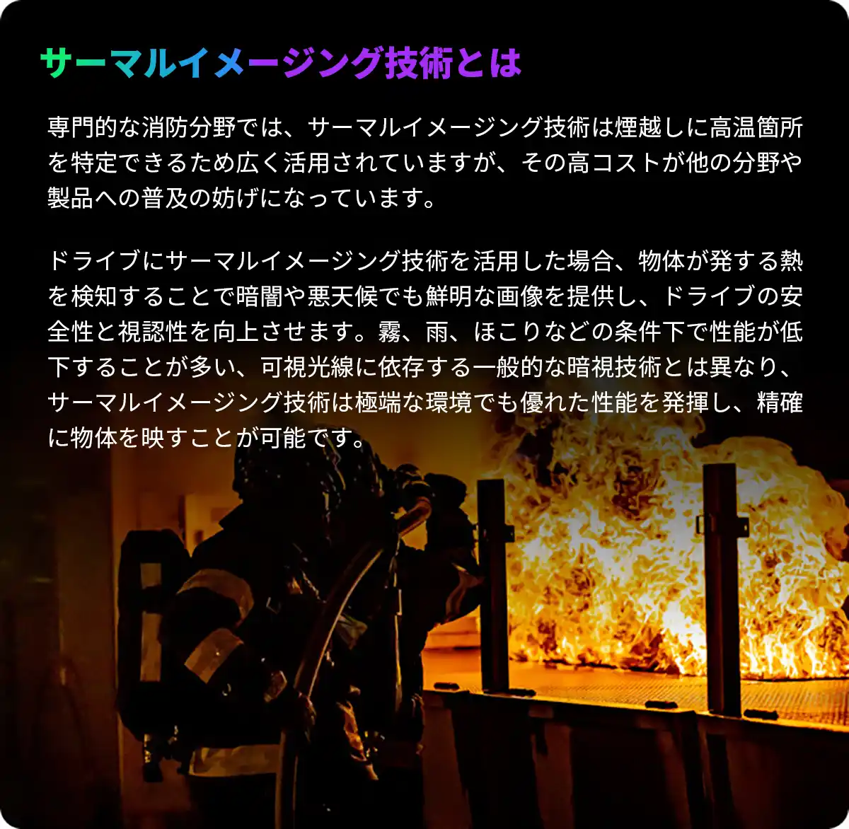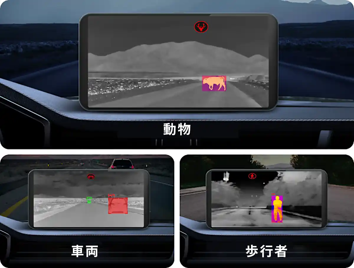 従来のカメラでは視界が悪化する夜間や霧・雨・雪などの悪天候時でも、サーマルカメラが歩行者や障害物を検知し、AIが解析することでドライバーをサポートします。