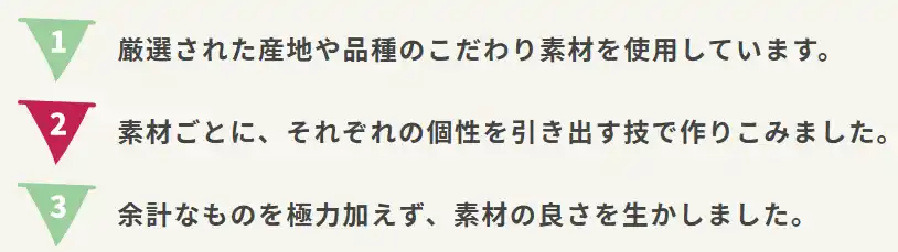 | 素材の良さを存分に生かし、丁寧に作り上げたおいしさをお楽しみください。 | ||||||||||||||
