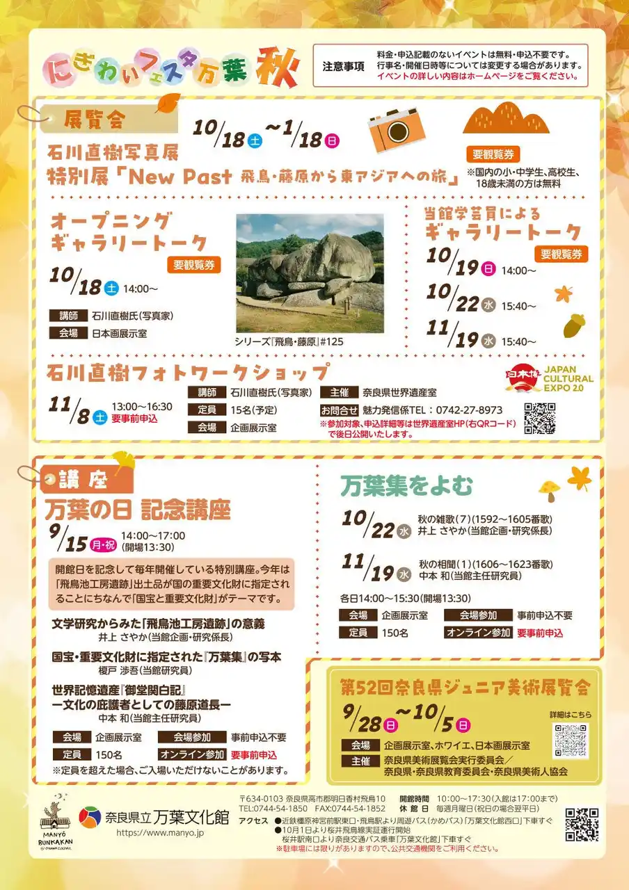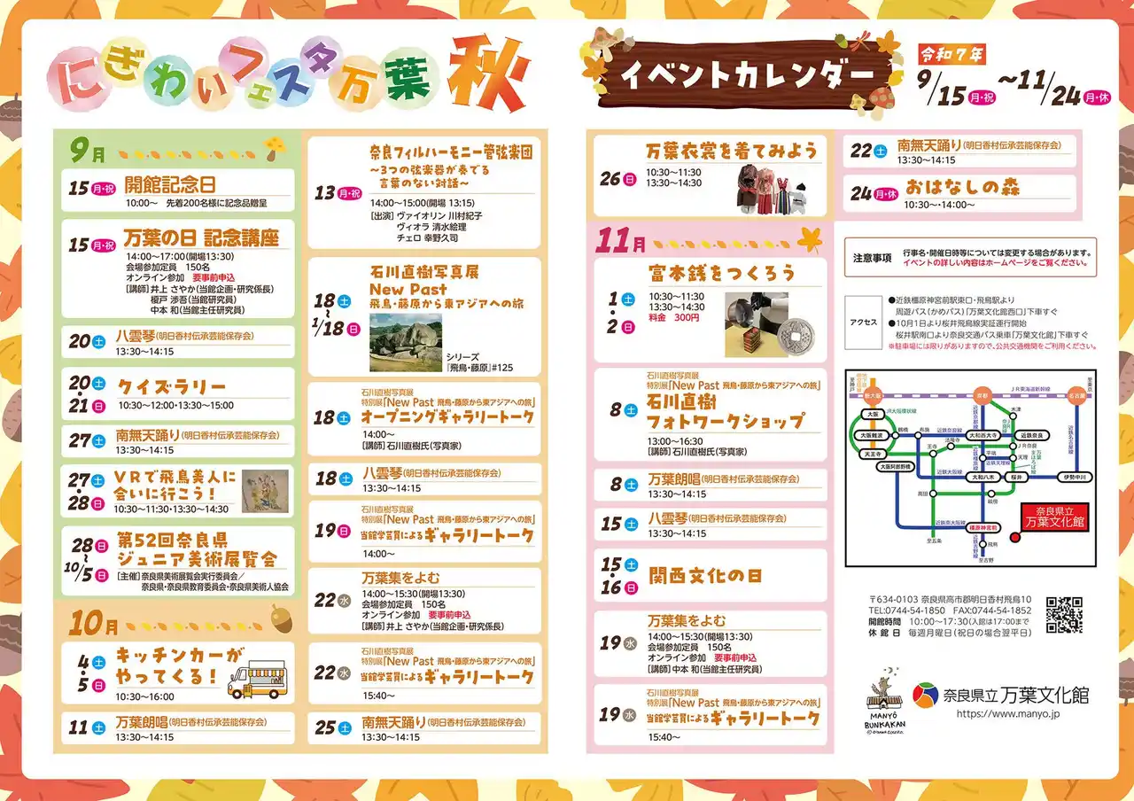 | 奈良県立万葉文化館では9/15(祝)~11/24(振休)の間、「にぎわいフェスタ万葉 秋」を開催します。土日祝日を中心に、イベント盛りだくさんで皆様のご来館をお待ちしております。各イベントの詳細は別紙チラシをご覧ください。 | ||||||||||||||