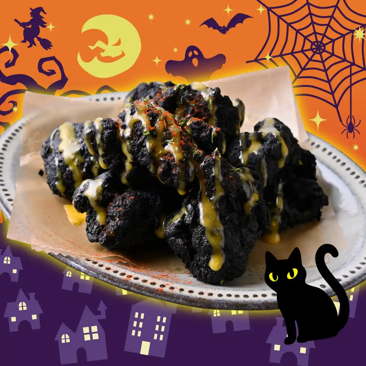 | 中はジューシー、外は真っ黒。ゾンビもびっくりのハロチキ!見た目は怪しくても、食べればやみつきの旨さ! | |||