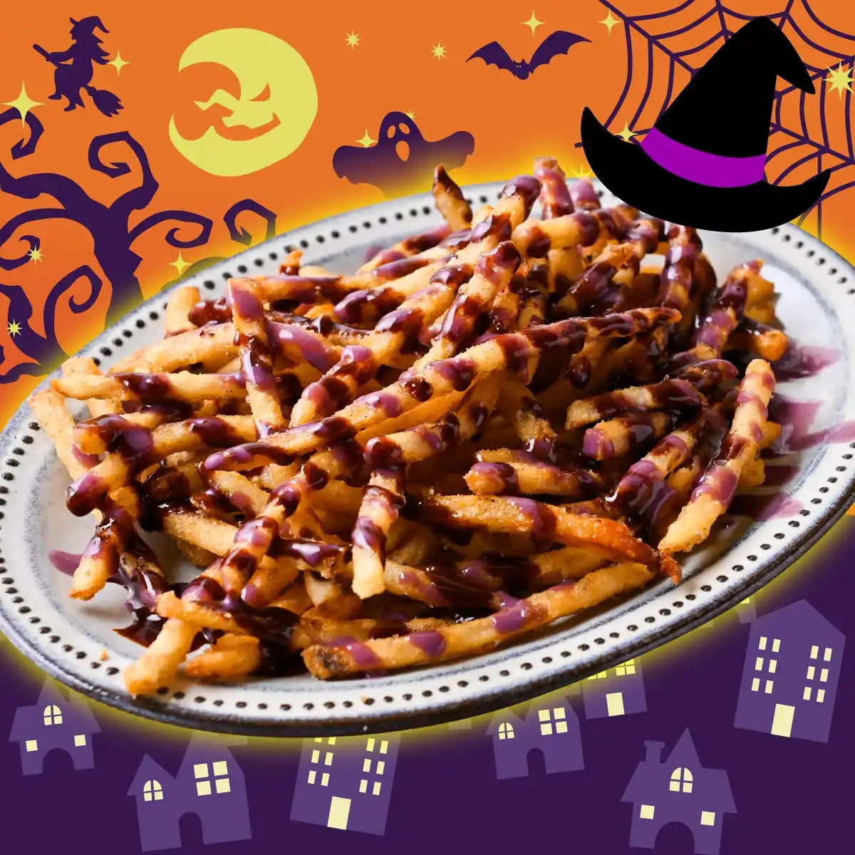 | パープル×スパイスの魔女味。見た目も味もトリック級!チョコソースのダークな色合いに、妖しく輝くパープルソースが絡み合うハロウィン映えの一品。 | |||