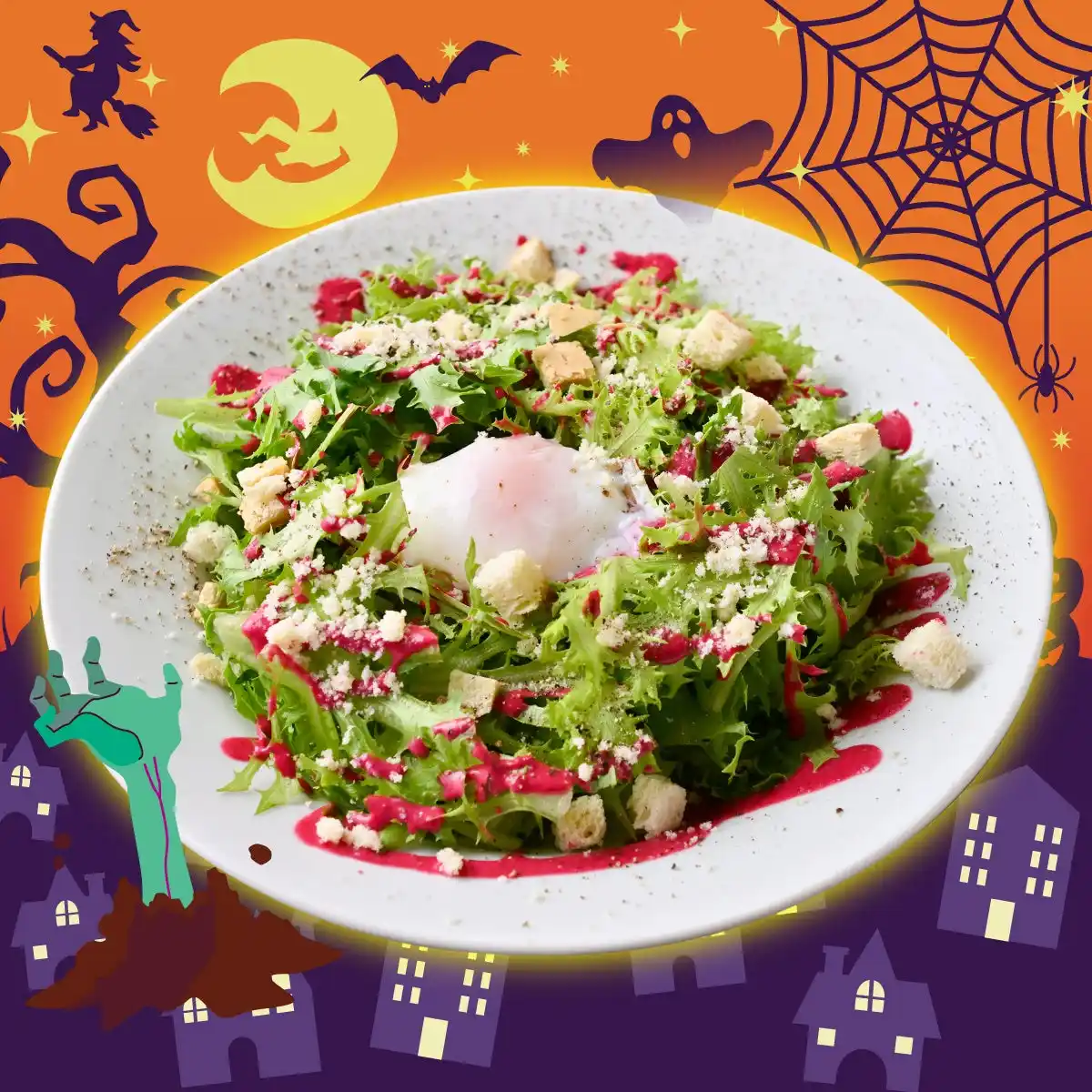 | 真っ黒な乾杯ソーダでハロウィンの夜に乾杯♪不気味なソースでドレスアップした「ゾンビのシーザーサラダ」や「魔女ポテト」、外は真っ黒で中はジューシーな「漆黒のフライドチキン」、黒チーズに包まれた「悪魔の溶岩チーズハンバーグパスタ」、そして脳に焼き付くインパクトの「とろける脳みそチーズケーキ」まで、不気味さと美味しさが交差する刺激的なハロウィン体験をお楽しみいただけます。 | |||