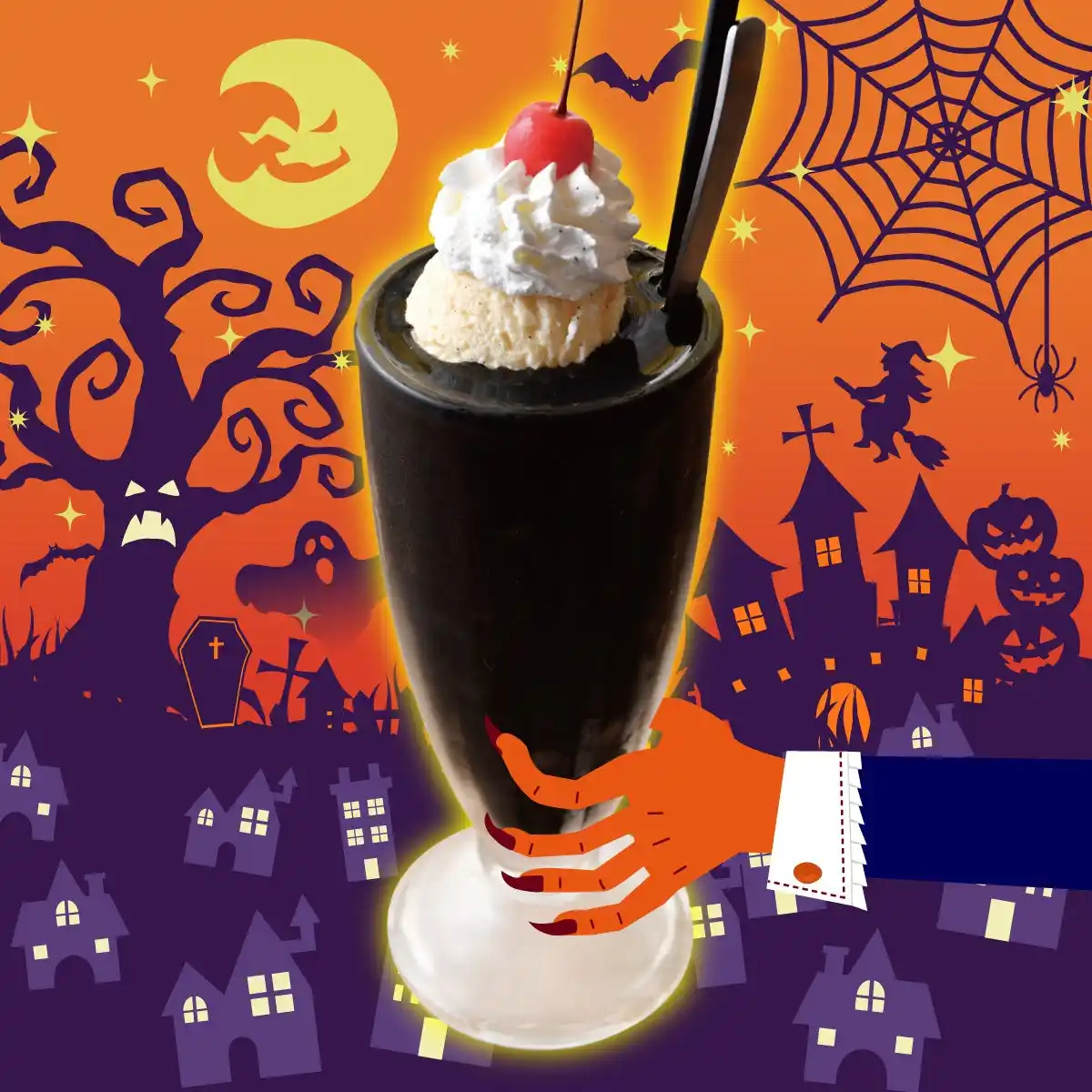 | 真っ黒なソーダに浮かぶバニラアイスと真紅のチェリー。闇夜に輝く一杯は、見た目のインパクトも抜群!ハロウィン気分を盛り上げる、怪しく甘い乾杯ソーダです。 | |||