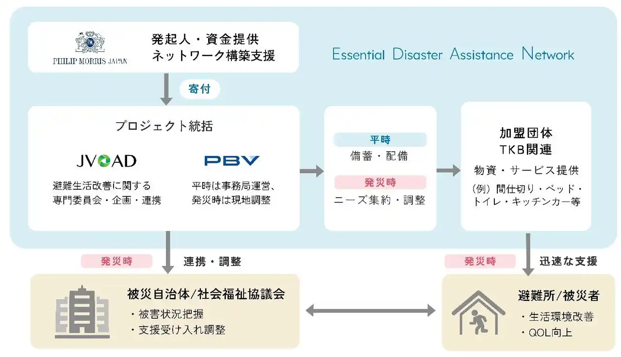 | フィリップ モリス ジャパン合同会社(本社:東京都千代田区、社長:シェリー・ゴー、以下「PMJ」)は、特定非営利活動法人 全国災害ボランティア支援団体ネットワーク(所在地:東京都千代田区、代表理事:栗田暢之、以下「JVOAD」)と共同で、日本で初めて民間主体の、避難生活に特化した支援ネットワーク「EDAN」(Essential Disaster Assistance Network、読み:イーダン)を9月1日(月)に設立することを発表しました。 | |||