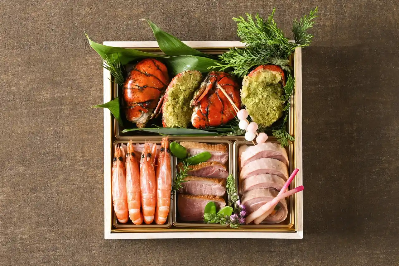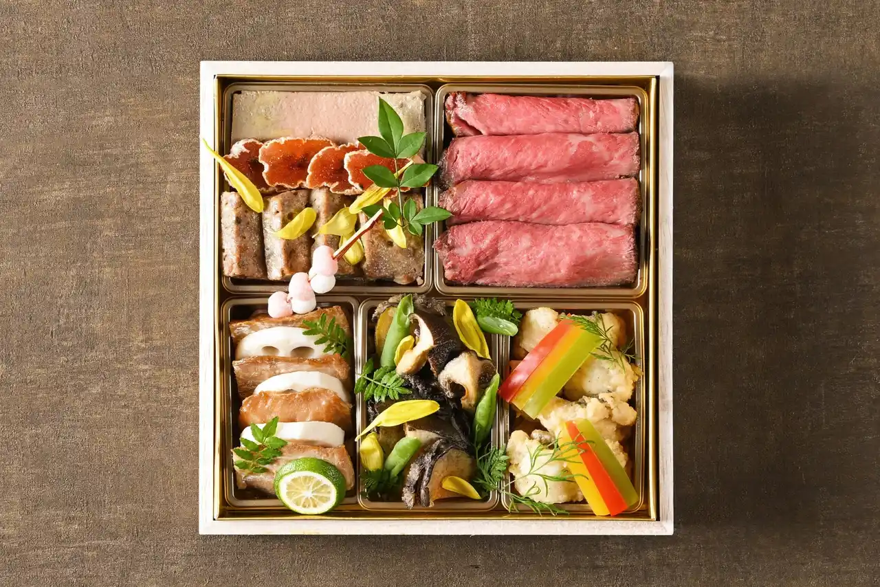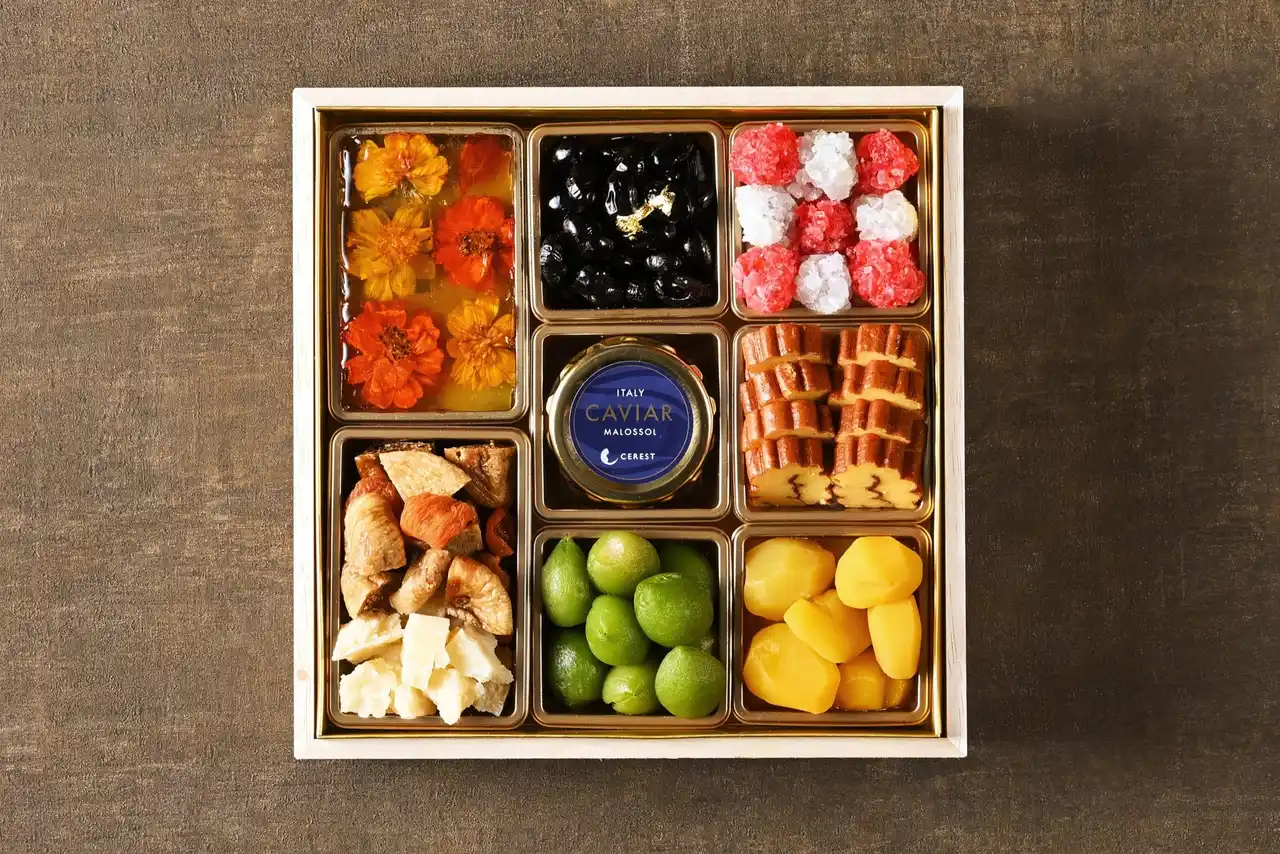 グアナラチョコレートと錦玉羹のテリーヌ/栗きんとん/イタリア産キャビア/クランベリーの琥珀糖包み/パルミジャーノ・レジャーノ/セミドライフルーツ/丹波ぶどう豆 赤ワイン味/若桃甘露煮/メープル香る伊達巻 |